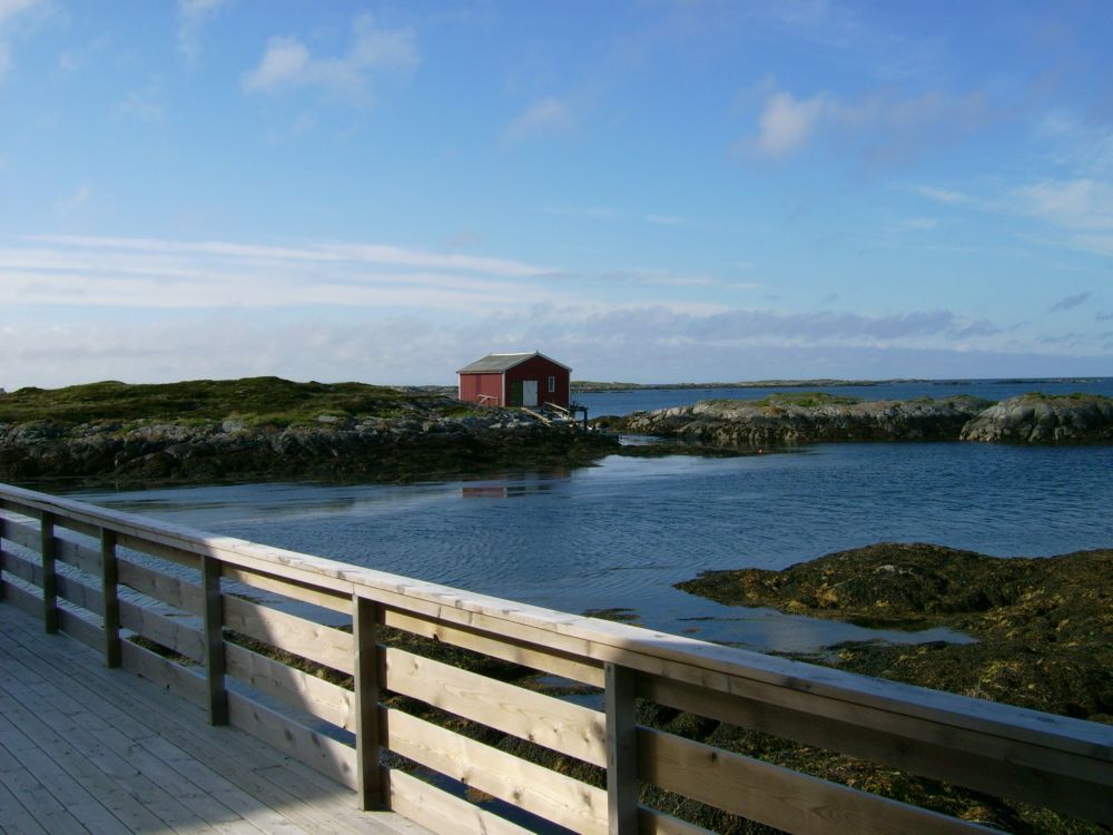 Mitten in der Nacht haben wir das Hochgebirge passiert, dunkel war es nicht....aber kalt. Nur noch 6 Grad. Steffen und Markus mußten einen Umweg über Trondheim machen, das Auto von Steffen fuhr mit Gas und eine entsprechende Tankstelle gab es um diese Uhrzeit nur noch dort. Ingo und ich sind ohne Umweg nach Vinsternes zur Fähre gefahren und hatten Glück. Die Zeit war knapp geworden, viele Kilometer konnte man in einer Stunde nach nicht schaffen, aber wir waren um 7.03 Uhr dort und die Siebenuhrfähre hatte 5 Minuten Verspätung. Also konnten wir auch die Anschlussfähre von Aukan nach Edöy nehmen und waren dann um 8.30 Uhr erschöpft aber glücklich an unserer Hütte. Harry, der Eigentümer, hat schon auf uns gewartet und hat uns das Haus, die Boote, das Schlachthaus usw. gezeigt. Nach einer kurzen Einweisung und einen Klönschnack mit Peter Palm haben wir das Auto ausgeräumt und den Ausblick von der Terrasse genossen, es war zwar recht diesig, aber egal, wir waren endlich da.