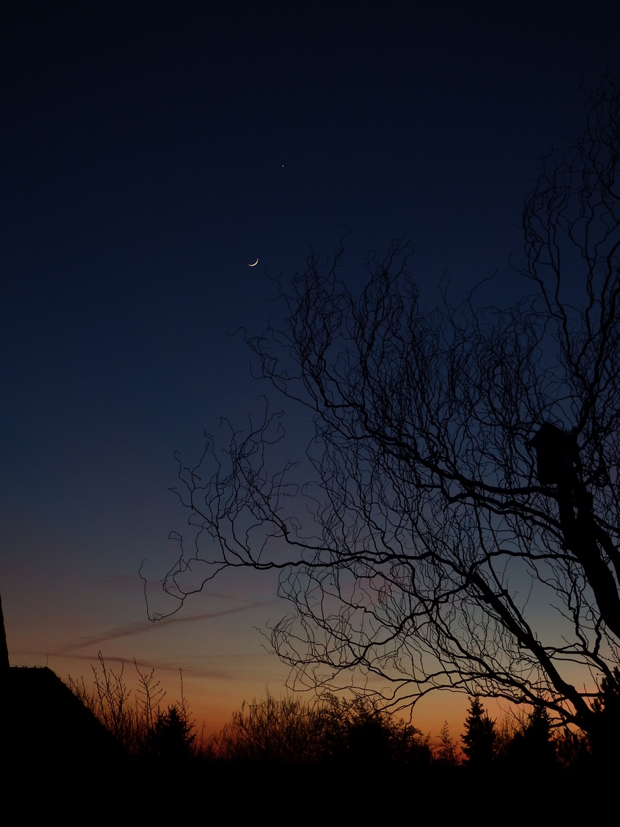 Am Wochenende war ich etwas spät dran, aber auch die Zeit nach dem Verschwinden der Sonne bietet interessante Motive. Hier mein Gartenpanorama im Schein der untergehenden Sonne, am klaren Himmel die schmale Sichel des Mondes und darüber die Venus.