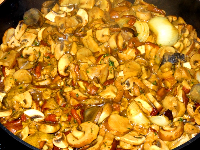 Normal kommen die getrennt in die Pfanne aber bei den insgesamt 6 Stück lohnte das nicht,die haben eigentlich eine etwas kürzere Garzeit aber in dem Fall kamen die einfach zu den anderen Pilzen und wie immer pur,kein Ei oder was auch immer,nur etwas Margarine in die Pfanne und Zwiebeln ....fertig.