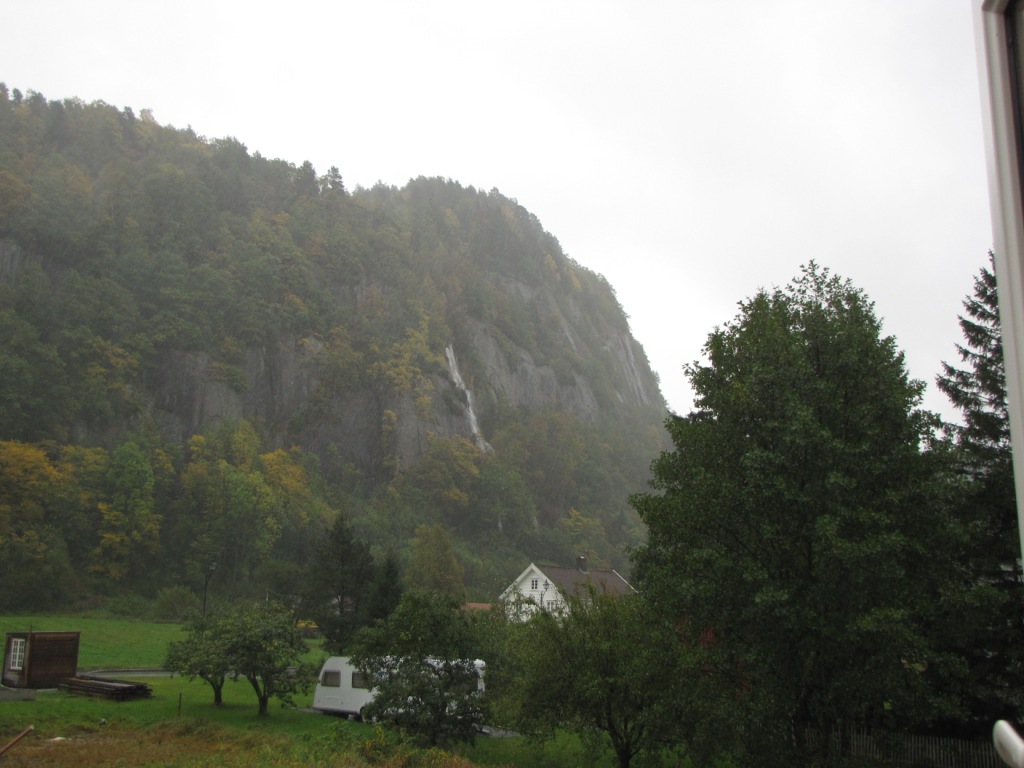 Also ging es morgens um acht auf nach Stavanger – laut Navi 141 km in 2 h 8 min. Leider gab es auf der E 39 irgendwo eine Vollsperrung und das Navi leitete uns über die „alte“ 44. Das war im Grunde nicht schlecht, da die Landschaft natürlich viel beeindruckender ist, aber die Tour verlängerte sich dadurch um 30 min. In der ersten Stunde der Fahrt hatten wir geniale Ansichten, da noch einiges an Nebel auf den Bergen lag (siehe Bild).