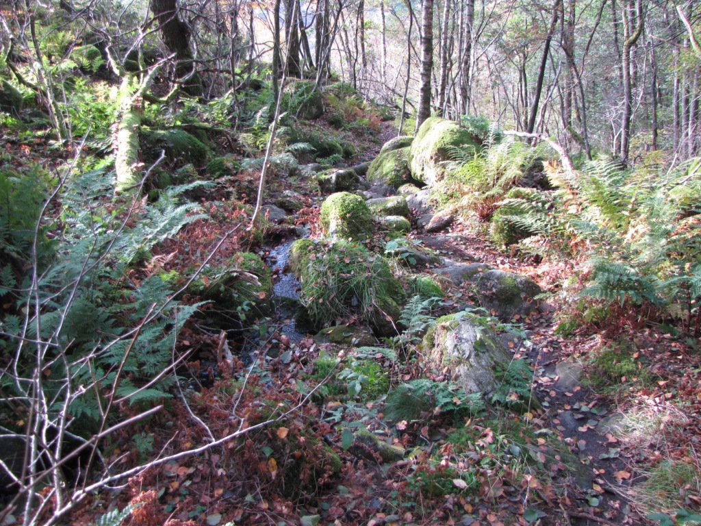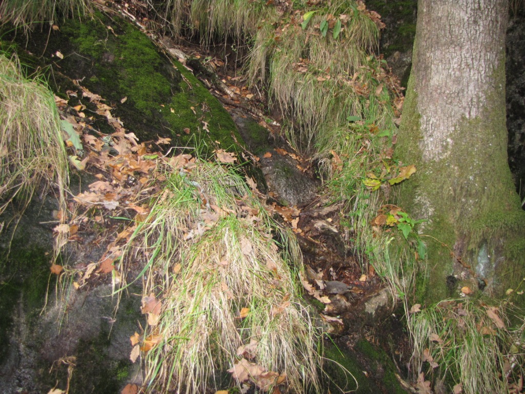Da es dort nicht weiter ging, machten wir uns auf den Heimweg. Als wir schon ein Stück am Geiteknuten vorbei und fast wieder in der Zivilisation waren, glaubte ich meinen Augen nicht zu trauen. Da stand doch etwa in Kniehöhe ein Wegweiser u.a. zum Orresteinen, aber leider aus der falschen Richtung zu lesen (Bild). Als wir hochwärts dort vorbei gekommen sind, konnten wir den gar nicht sehen. Und wer vermutet Wegweiser schon in 40 cm Höhe? Wir haben kurz überlegt, ob wir den Weg noch einschlagen, die Zeit war ja auch schon voran geschritten. Aber egal, jetzt waren wir schon mal hier, also was soll’s. Der Weg stellte sich teilweise als ziemlich steil und abenteuerlich heraus, vor allen Dingen, da es aufgrund der massiven Regenfälle der letzten Woche äußerst rutschig war. Wir kamen dann nach etwa 30 min auf eine Kuppe mit richtig guter Aussicht, von der wir eigentlich dachten, es sei der gesuchte Orresteinen, aber mir fiel dann ein, dass da laut Beschreibung eine Leiter für die letzten paar Meter und ein Gipfelbuch sein sollten. Also mal kurz um die Ecke geschaut und da stand doch tatsächlich nicht ein weiterer Wegweiser. Also sind wir diesem gefolgt. Leider ging es jetzt wieder bergab und ins Landesinnere. Wir mussten noch eine Schlucht überwinden und hier hatten wir dann das Problem. Ich vermute mal, dass wir vor dem letzten langen Anstieg vorm Berg waren, als wir einen vermoosten und richtig glitschigen Felsen (Bild) hoch mussten. Leider waren Hilfsmittel wie ein Seil oder Bäume zum Festhalten Fehlanzeige. Es gab auch keine offensichtliche Möglichkeit das zu umgehen und direkt davor stand ein Wegweiser. Also ich traue mir ja Einiges zu, schließlich kraxeln wir bei uns auch genug in den Bergen rum, aber hier war doch Schluss. Hoch wäre ja vielleicht noch gegangen, aber runter war mir das echt zu heiß. Man muss ja im Urlaub nicht seine Gesundheit aufs Spiel setzen. Also sind wir leider unverrichteter Dinge umgekehrt.