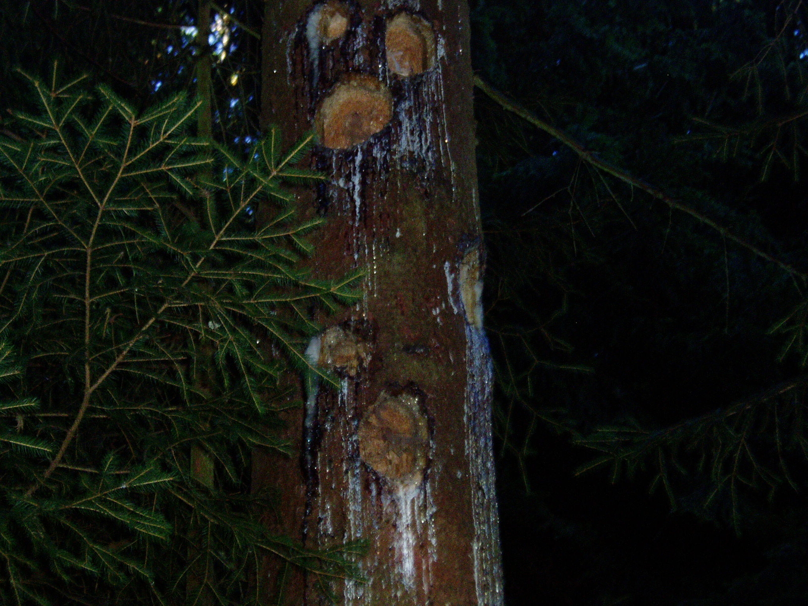 Die angepickte Fichte ist vom Frühjahr,jetzt läuft das Harz volle Kanne.