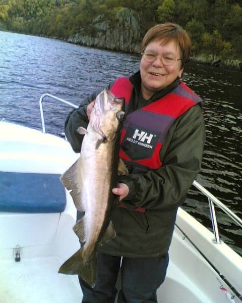 Aber – typisch für den ersten Tag: Dorschpapa fängt kleine Makrelchen und Seelachse; Dorschmama freut sich über einen 65-er Pollack von gut fünf Pfund. Aber ich hab es ihr gegönnt – nur, wer da am Lästern war, brauche ich ja wohl nicht zu beschreiben. Die nächsten Tage brachten dann auch noch ein wenig „mittelprächtige“ Exemplare, von denen nur noch ein 75-er Leng (Dorschpapa !! – geht doch), ein 65-er Dorsch und ein herrlicher Lippfisch zu erwähnen wären. Sonst kennt ja wohl so jeder die typische Beute. Kuriosum beim Angeln mit Farsundklaus – dazu komme ich aber noch – wir haben da wohl ein „Nest“ mit Petermännchen aufgescheucht.