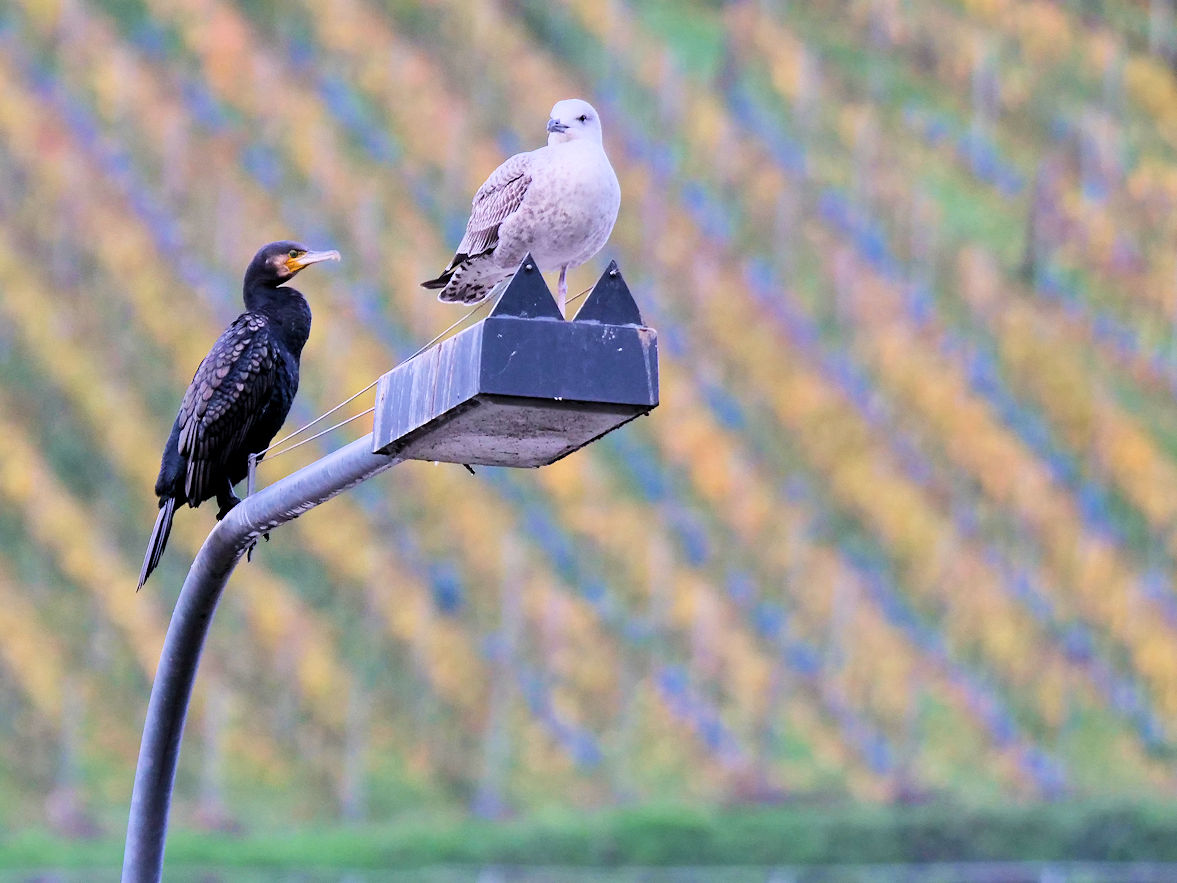 falls sich wer fragt - die sitzen auf einem Laternenpfahl an der Schleuse der Staustufe Müden hier bei uns an der Mosel....der merkwürdige Hintergrund ist also ein echter Weinberg (im Gegensatz zu den Weinfeldern in anderen "wein"-Gegenden)
