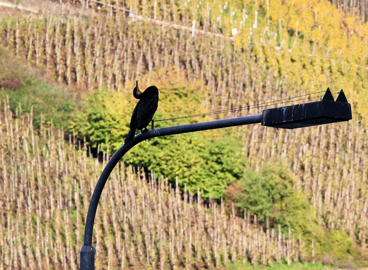 Kormoran auf Laternenpfahl vor Weinberg ist "schon ein albernes Motiv"