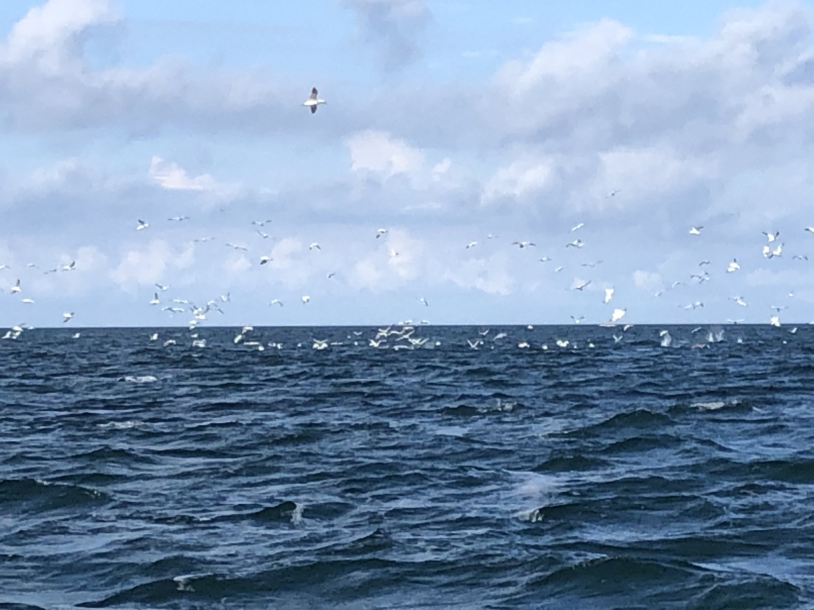 Heute haben sich etwa 200 Basstölpel mit einem großen Sandaal- Schwarm beschäftigt...