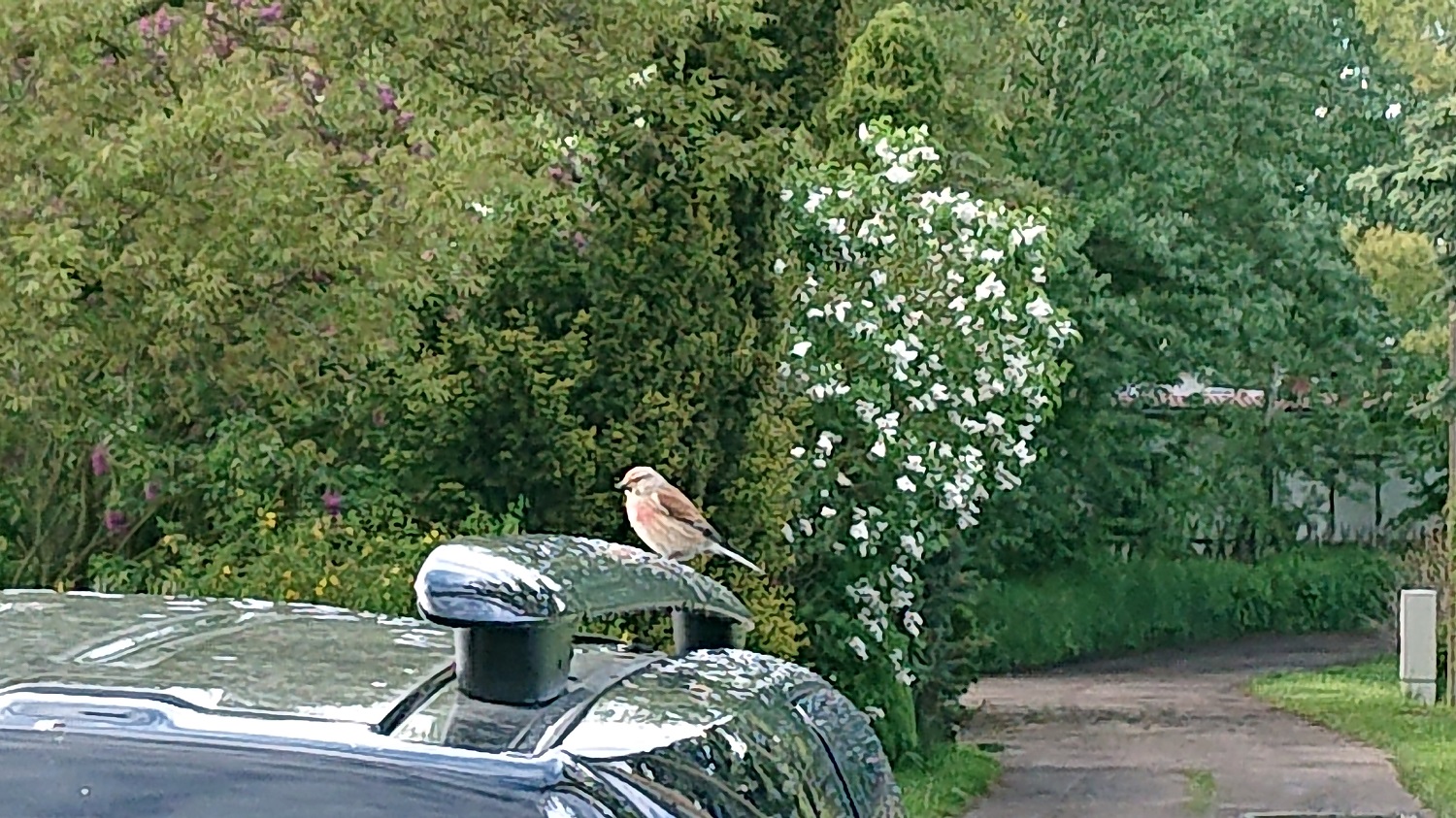 den ganzen Tag sitzt der Bluthänfling auf unserer Dachreling, während die Alte das Gelege