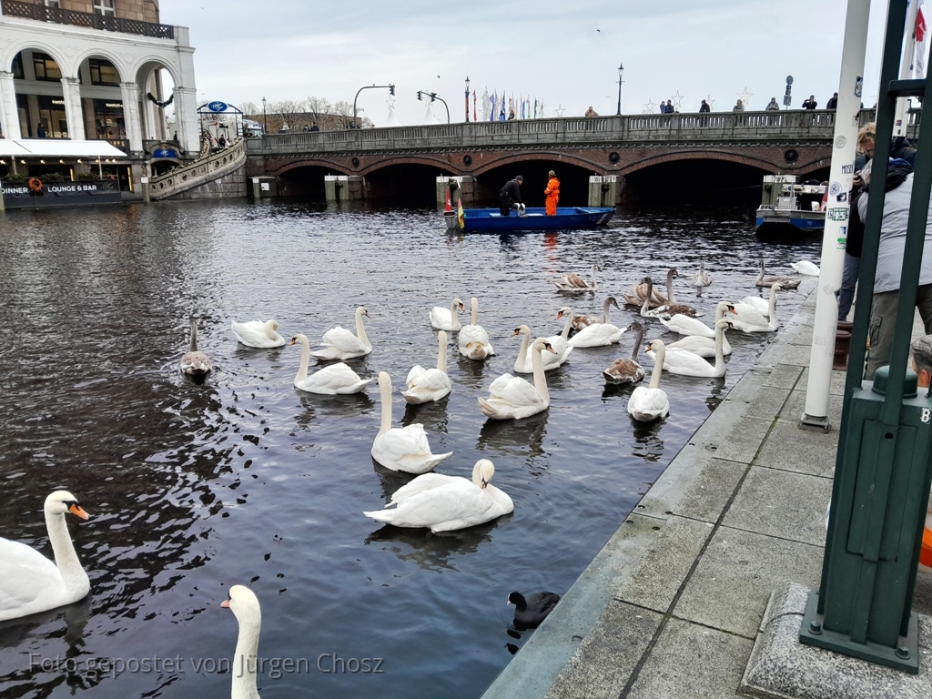 Heute werden die Hamburger Alsterschwäne in ihr beheiztes Riesenzelt mit Schwimmgelegenheit verbracht.Es waren mal 120 aber leider sind diverse durch einen Virus gestorben.Die auf dem Foto sind aber noch nicht alle.5 Boote plus einem Poizeiboot sind fleisig dabei sie von der ganzen Alster zur Rathausschleuse zu treiben.