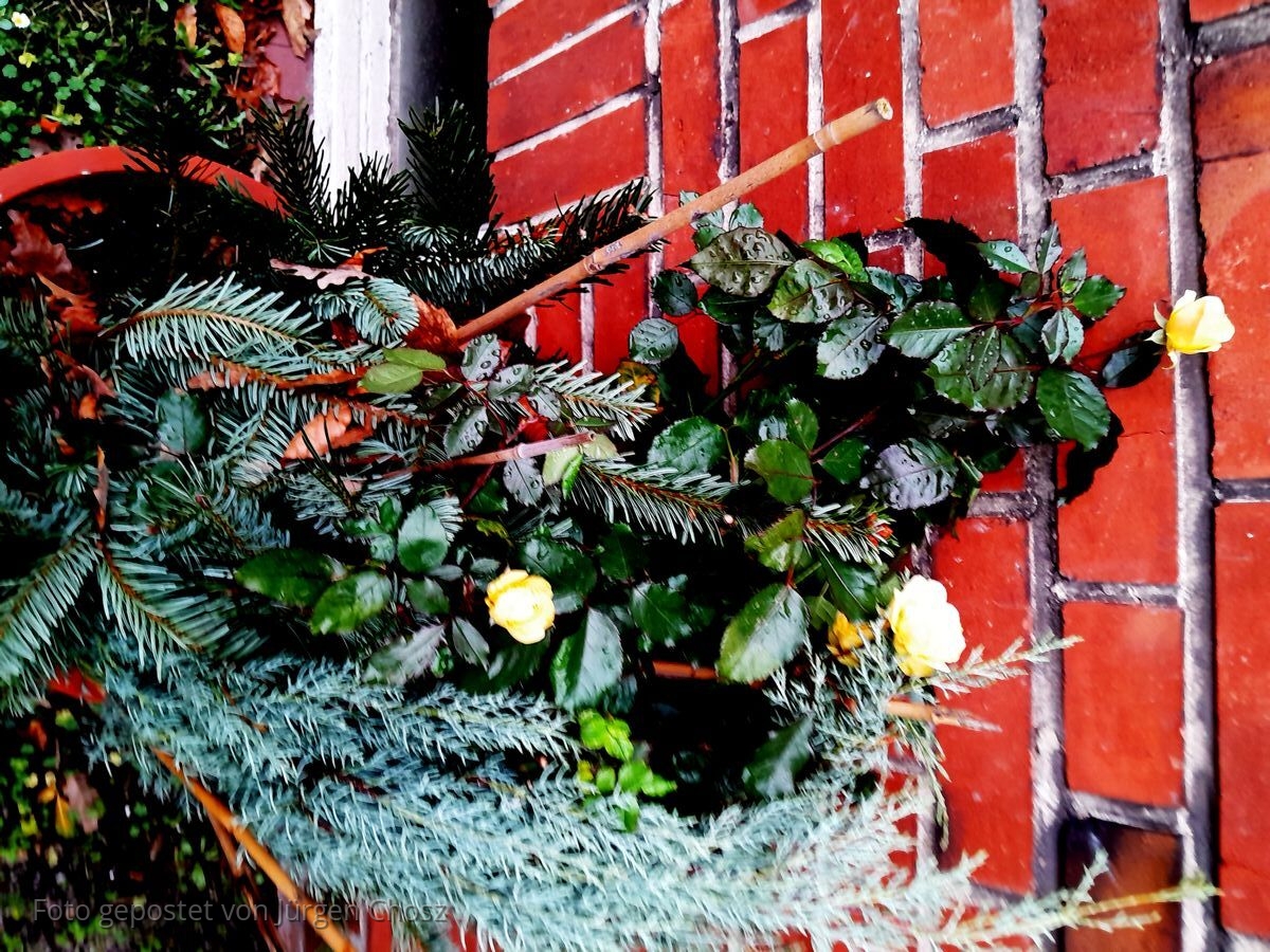 eben aufgenommen,meine Kübel-Rose vorm Hauseingang.Warum die Rose jetzt auf der Seite liegt?? Aber das die Blüten jetzt noch aufgehen sagt ja alles über den Hamburger Winter