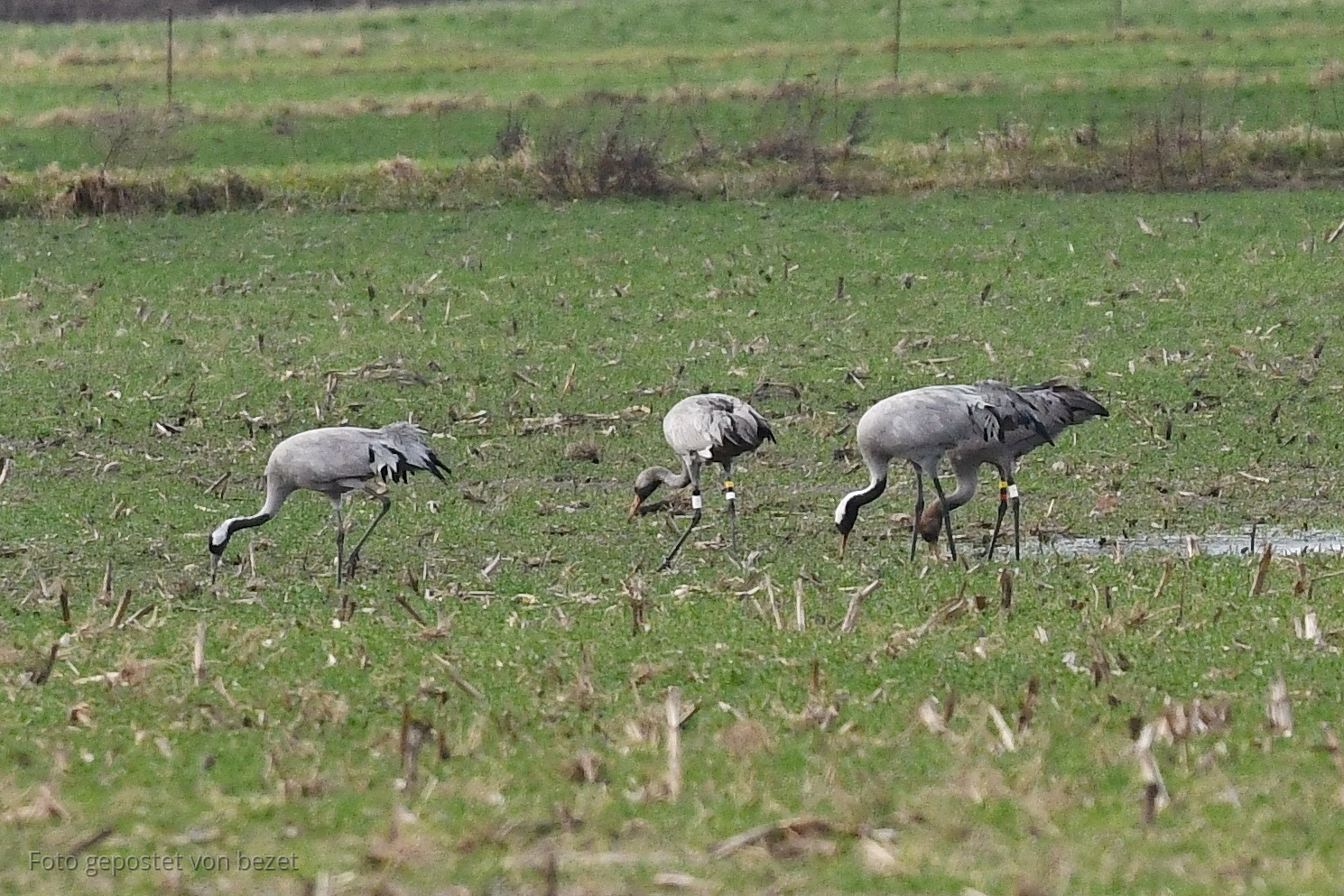 Ich habe da mal wieder farbringmarkierte Kraniche "aufgesammelt", die ich schon einige Zeit beobachte. Offensichtlich sind das diesjährige Geschwister mit ihren Eltern, die sich immer etwas separat von den großen Kranichschwärmen aufhalten. Sie wurden auf der Insel Saaremaa in Estland im Juni diesen Jahres beringt und zwischendurch auch in Polen beobachtet - immer zusammen. Familienverbund also.