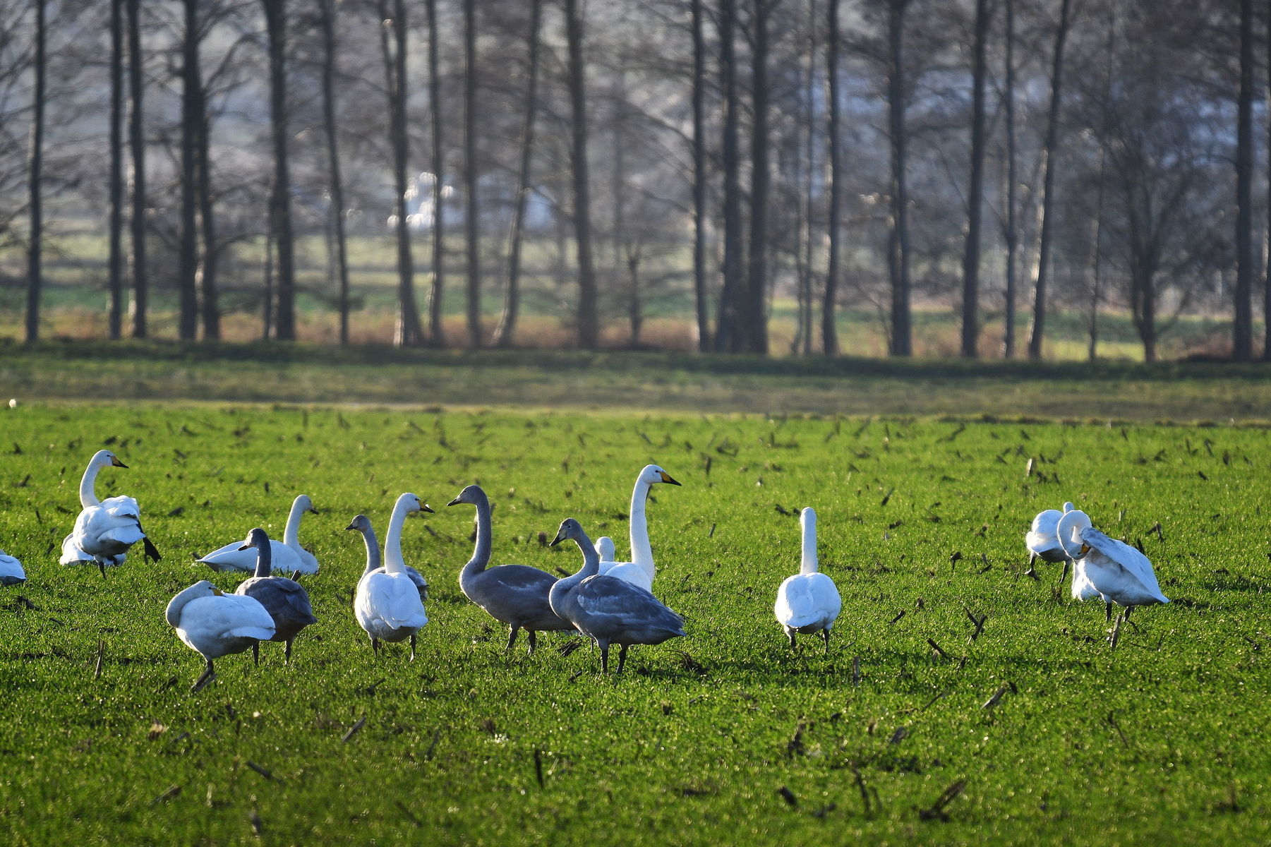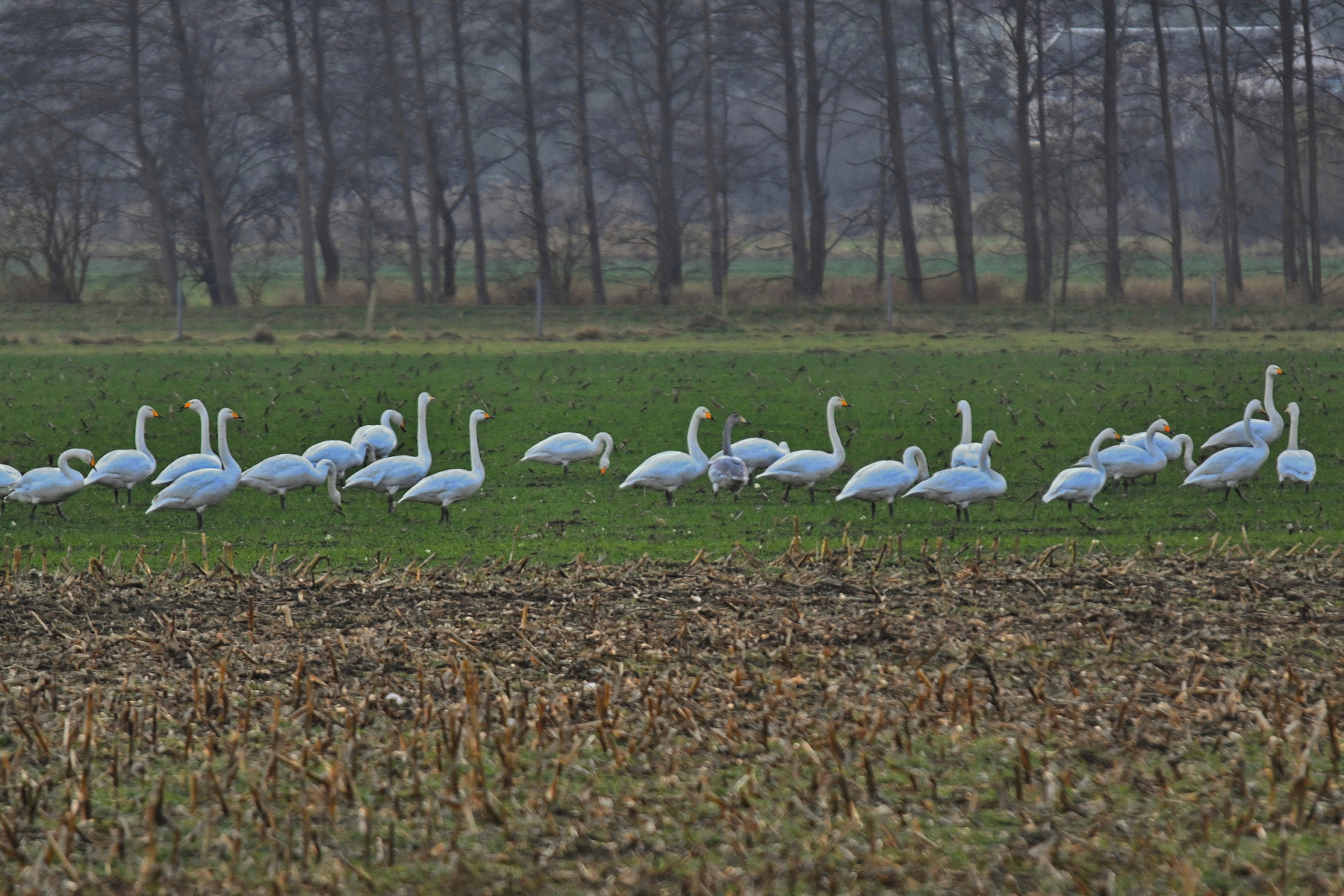 So sieht ein Schwarm Sing - und Zwergschwäne aus und nein, es sind nicht die sonst üblichen Höckerschwäne: