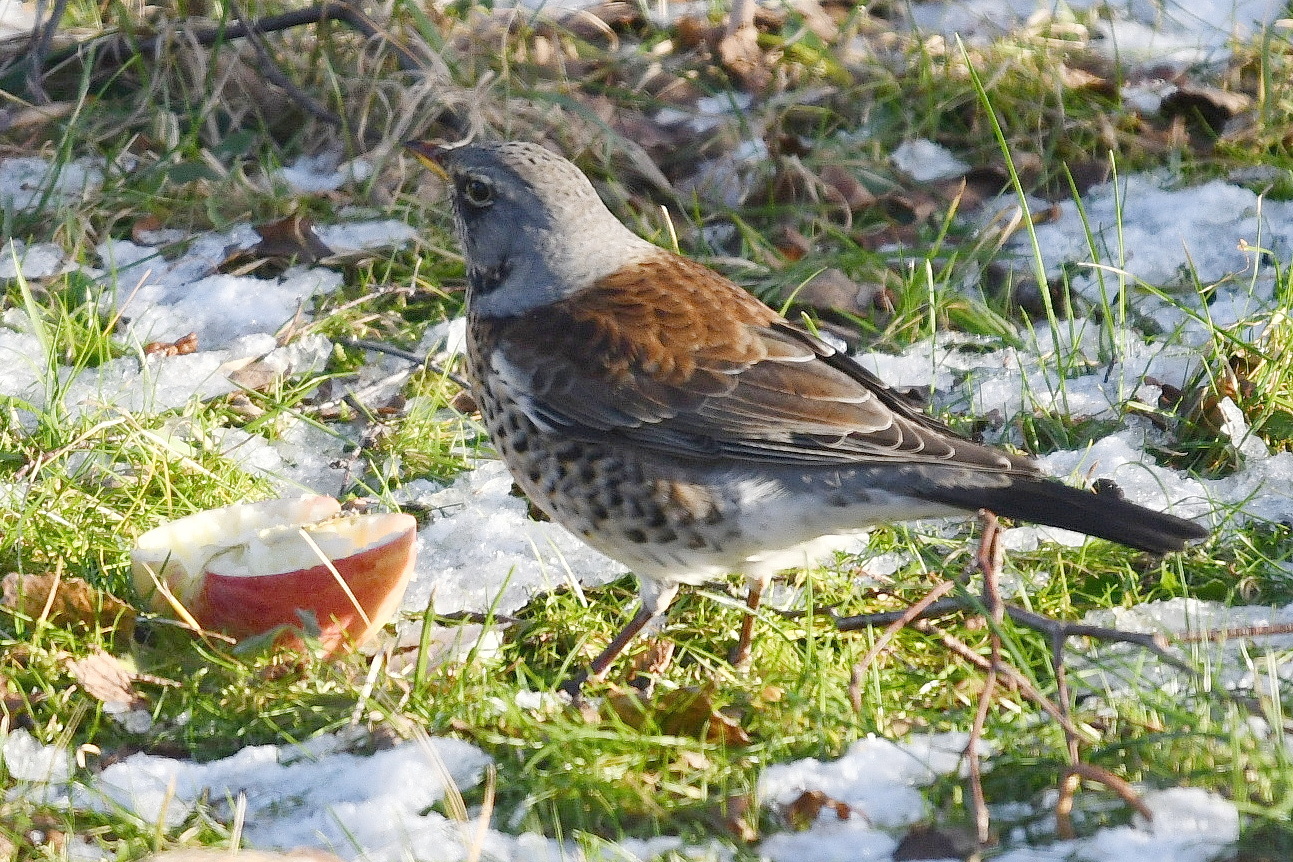 Wintergast - aus Norwegen (?): Wacholderdrossel an Apfel