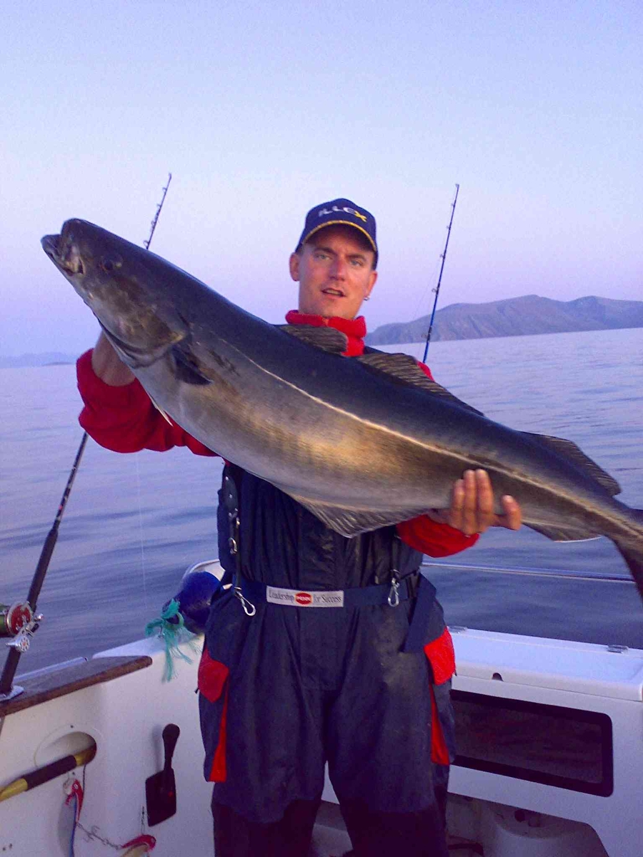 Nach wenigen Minuten haben wir das brodelne Wasser erreicht, Motor aus und Spinnruten mit zu Wasser..... und dann hatte Arnt an seinem zweiten Tag Speedpilken dass, auf was ich wohl nochlange warten darf, ein kräftiger Biss mit anschließender, nicht zu bremsender Talfahrt. Sein Drill über 100m tiefem Grund dauert so lange, dass ich in der gleichen Zeit einen Dorsch und danach eine Köhler ins Boot holte, eine Leerfahrt des Pilker hatte und zwei Kippen geraucht habe.....wir hatten echt Spaß !!!!