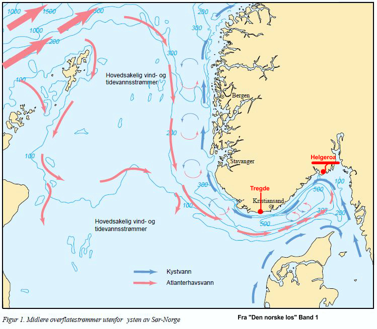 Es gab bis vor kurzem für Südnorwegen nur den Bezugspunkt Helgeroa. Jetzt kam Tregde als zusätzlicher Punkt dazu. Die Werte von Tregde waren aber rund 2 Stunden früher als die von Helgeroa. Das konnte einfach nicht angehen, denn in der Schrift von Kartverket „Den norske los“ wird diese Grafik gezeigt. Man kann hier die Richtung vom Tidestrom sehen.