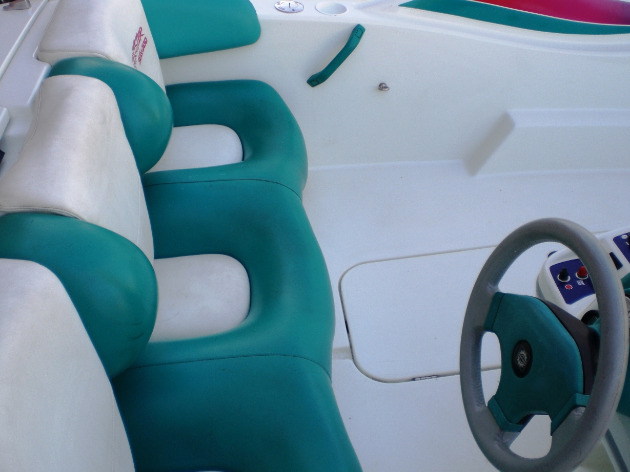 Es ist ein SEADOO Sportster mit einem Jetantrieb (bekannt aus den JetSki´s) Das Boot hat einen ca. 80 PS Motor und läuft so gute 60-65 Km/h auf dem Wasser. Wendenkreis = Teller. Um die Optik zu beschreiben mal ein paar Fotos anbei.