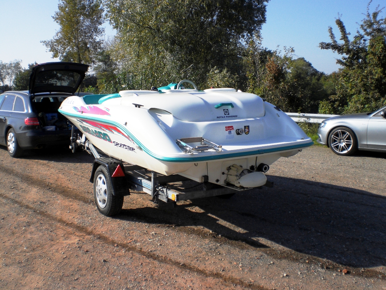 Es ist ein SEADOO Sportster mit einem Jetantrieb (bekannt aus den JetSki´s) Das Boot hat einen ca. 80 PS Motor und läuft so gute 60-65 Km/h auf dem Wasser. Wendenkreis = Teller. Um die Optik zu beschreiben mal ein paar Fotos anbei.