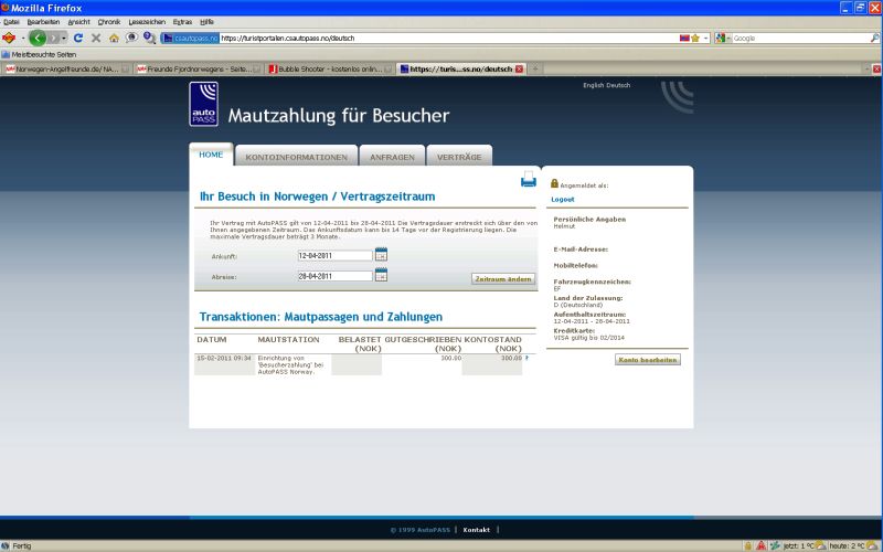 War letztes Jahr im September in Flekkefjord und sind zum Bummeln nach Stavanger . Die Mautstation ist auf Video umgestellt . Habe mich dann bei www.autopass.no angemeldet . Hat alles hervorragend geklappt . Es werden 300 Kronen abgebucht und nach 90 Tagen das Restgeld wieder zurück gezahlt . Kein Anhalten mehr und kein Kleingeld gesuche .