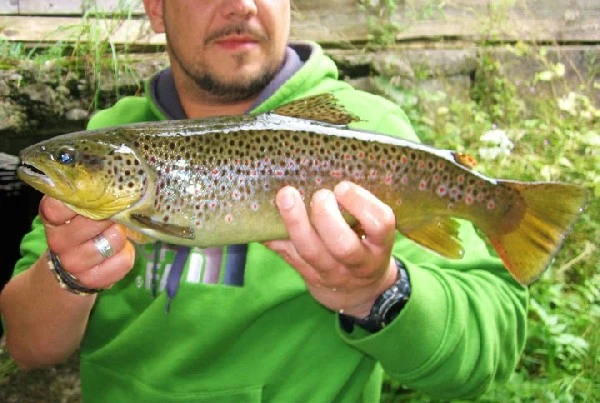 Heute war für mich Saisonstart an meinem Lieblingsplatz an der Paar. Ich fischte an einem kräftig strömenden Mühlauslauf, der aus einem ca. 1 Meter hohen (von der Wasseroberfläche aus gesehen) und ein Meter breiten Tunnel in ein Becken von etwa 15 qm fließt und von dort aus wieder in einen ca. 20 Meter langen Tunnel einläuft. Dort steht man ungefair 1,5 Meter über der Wasserfläche auf der Umrandung des besagten Beckens. Nach einigen erfolglosen Versuchen im langen Tunnel zu meiner Rechten, sehe ich plötzlich aus dem Augenwinkel einen ziemlich großen Schatten über Grund in den Mühlauslauftunnel links von mir verschwinden. Da dieser Tunnel aber recht kurz ist, das Wasser darin recht tief und man von oben in diesen gerade mal einen Quadratmeter großen Tunneleingang werfen muss, bekamen meine heißgeliebten Wobbler nun erst mal eine Pause. So, aber wat nu? Alle Bleiköppe, die ich dabei hatte waren schneller aus dem Tunnel wieder draußen, als ich Mississippi sagen konnte - zu leicht! Aber die Trutte war immer noch drin. Also Köderboxen durchforstet und das einzige, was schwer genug war, um den Boden in dem kurzen Tunnelstück zu erreichen war ein Myranspinner (Toni-z in 18 Gramm). Die Taktik ging auf, ich schlenzte den Spinner in den Tunnel, ließ ihn zum Grund sacken und kurbelte ihn zeimlich fix wieder ein - nix! So ging das in etwa 10 mal, bis ich einen kurzen Anfasser hatte. O.k. registriert wird der Spinner schon mal, aber ob the big one, ihn auch nehmen wird?? Weitere zehn Würfe später hatte ich die Antwort, als sie hing. Nach ein paar Minuten Drill hatte ich meinen neuen persönlichen Baforekord in den Händen 61 cm, wunderschön gezeichnet und ordentlich fett. 4 weitere Bachschönheiten zwischen 25 und 37 cm rundeten den Tag noch ab. So darf es gerne weiter gehen.