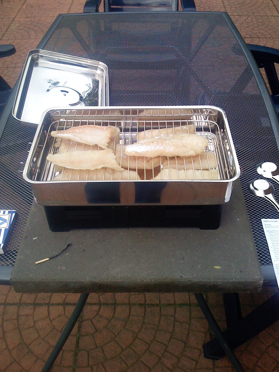 Dann kommt der Fisch rein,auf dem dazugehörigen Rost.Deckel zu.