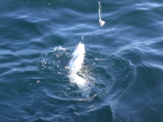 Der Fisch wurde aus 120 Meter in der Abdrift mit einer Slammer 360 hochgepumpt und der Fisch kam in ca 30 m Entfernung zum Boot wie ein U-Boot hoch.