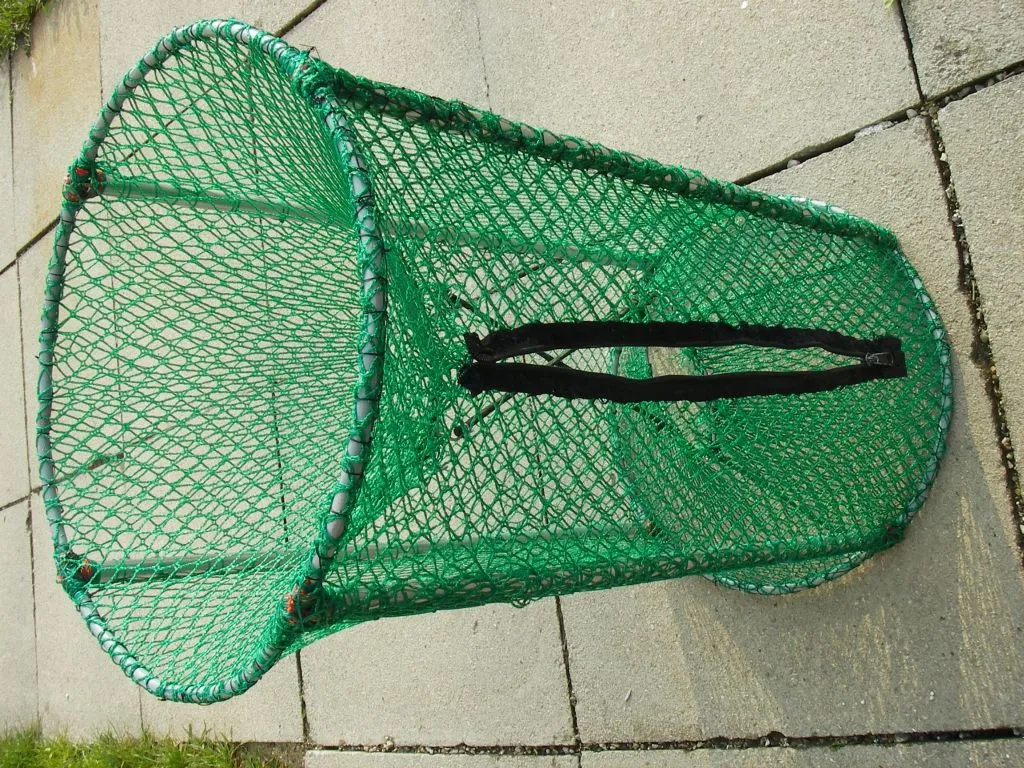 Diese Reuse ist schon ok!Ich habe mir einige Reusen selbst gemacht,die etwas größer sind!Zwei Ringe mit ca.400 mm ø und verschweißt mit 5-6 ca.700mm langen Stäben aus Blitzschutzdraht mit 8mm ø.Das Ganze überzogen mit einem Netz mit Maschenweite 15 x 15 mm.An beiden Enden einen ellipsenförmigen Einschlupf aus 3mm Edelstahlschweißdraht gebogen und in das Netz gehängt und mit Gummispannern und Haken diagonal von einem Einschlupf zum anderen verspannt.Zum Entleeren nähe ich einen groben Kunststoffreißverschluß an einer Längsseite ein.
