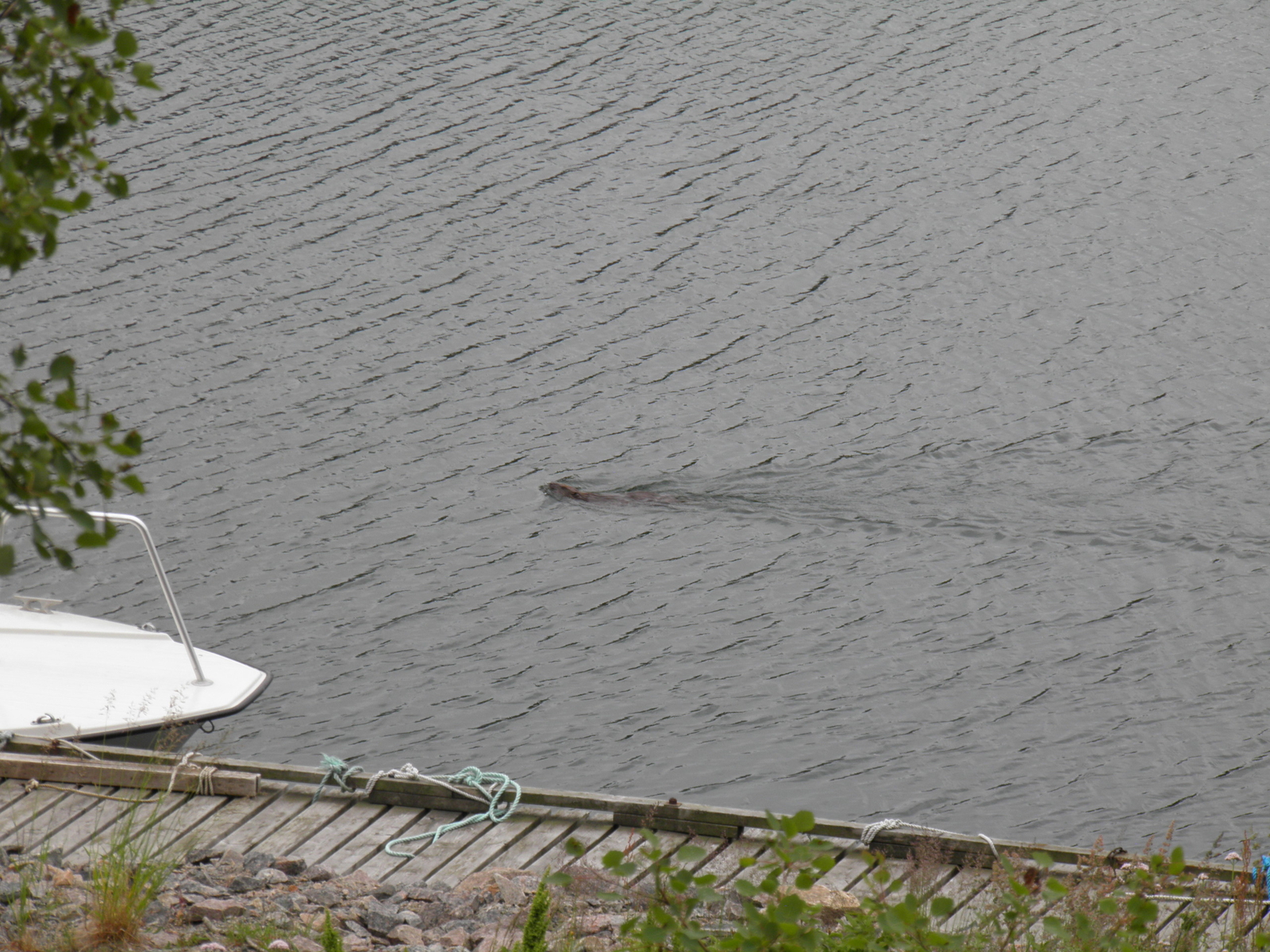 Zur kurzen Erklärung: Es war dieses Jahr im Juni bei Furuholmen als wir aus unserem Ferienhaus schauten sahen wir in den frühen Morgenstunden ein Tier von unserem Steg ins Wasser springen. Es ist zur anderen Uferseite geschwommen. Es gelang uns zwei Fotos zu machen die ihr nun seht. Was denkt ihr um was für ein Tier es sich hier handelt ? Ist bestimmt einfach oder? Noch ein Hinweis es war ähnlich groß wie eine ausgewachsene Katze.