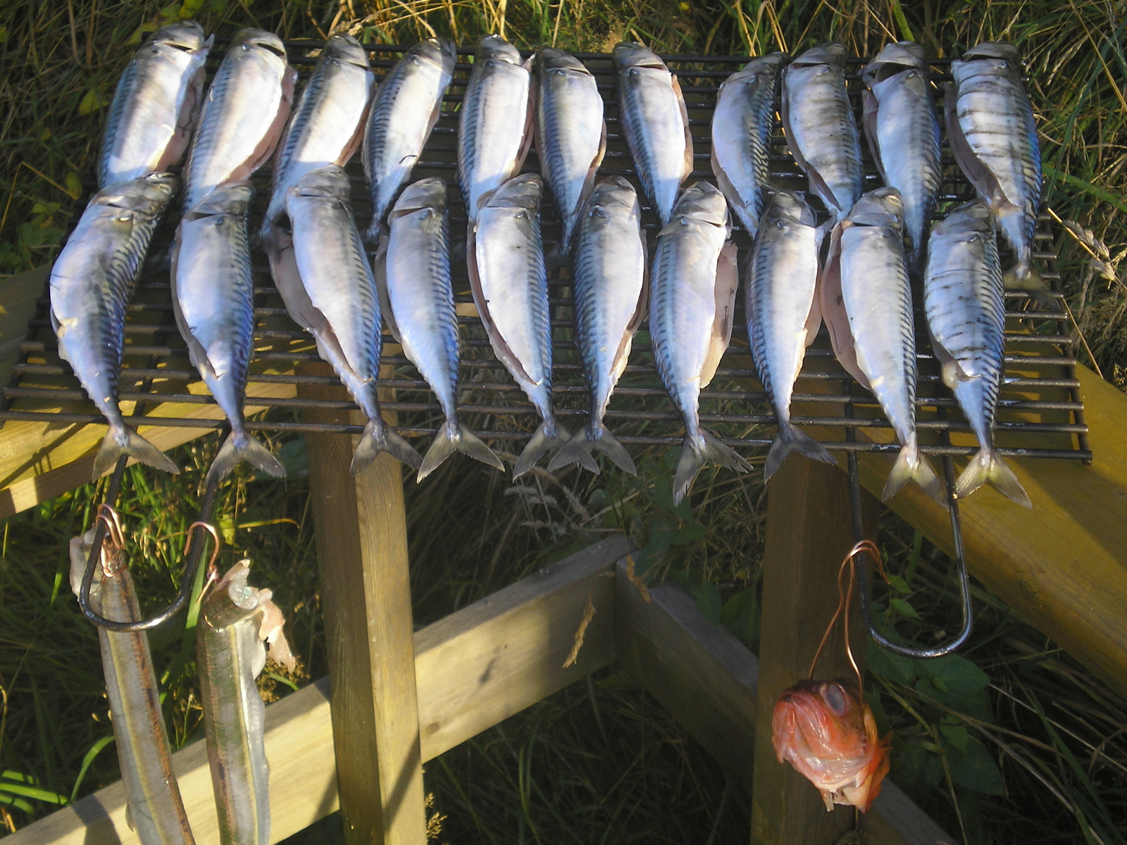 Während die Fische versorgt und verstaut wurden, bereitete ich noch schnell die Makrelen für den Räucherofen vor, die wir am Tag zuvor eingelegt hatten.