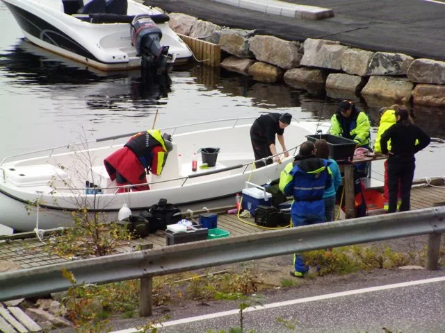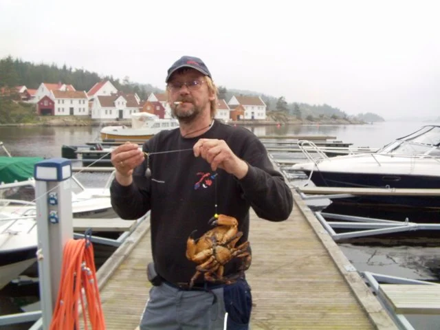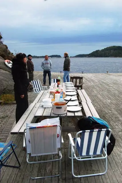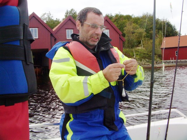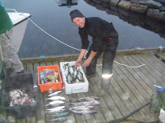 Das Haus am Hang ist schnuckelig und einfach urgemütlich mit großer überdachter Terrasse auf der man grillen konnte aber auch die Ruten und all das andere was son verrückter Angler an überflüssigem mit sich rumschleppt abstellen kann. Auf der anderen Straßenseite am Steg lag unser zwar etwas langsames dafür aber großes und hochbordiges Schlachtschiff womit man hin konnte wo man wollte. Durch einen glücklichen Umstand konnte ich jemanden kennenlernen der mir für sehr kleines Geld noch ein 25Pser für die Woche überließ so das man sich aufteilen konnte was sich für mich als ein Glücksfall da stellte da ich durch eine Schulterverletzung nicht schwereres Angeln auf Grund und Pilken ausüben konnte. Vom Bootsteg fing Daclaus gleich am ersten Abend auf Butt-Doppelvorfach einen sehr schönen Aal der natürlich gleich wieder zurück ins Wasser durfte, am 2ten Haken hing doch glatt ein Pilksystem mit einem nagelneuen Pilker, somit wurde er von Norwegen doch schon mal reich beschenkt und willkommen geheißen:).Die Stimmung zwischen Maggl, Thomi, Clausi, Gerald ,Olli ,mir und unserer sympathischen Norgeanfängerin Mareike