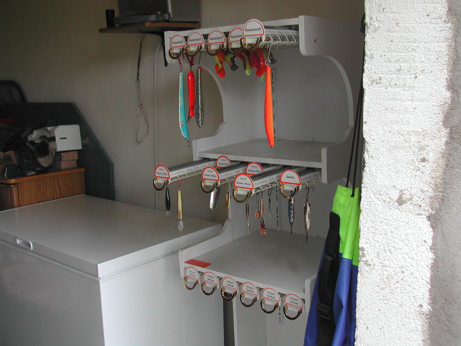 So-ich war Samstag beim Umzug einer Schneiderei dabei und dort wollte man folgendes Schrankteil zum Müll befördern (Siehe Bild). Als ewig "Zimmerbauer" ist mir natürlich gleich eine Idee gekommen wie ich das Teil für mein Zimmer nutzen kann. Und so wie auf den Bildern wird es auch genutzt -nur noch sortieren und neue Beschilderung ran und vorallem alle Pilker/Blinker usw. ran-dann sieht es wieder schickaus.