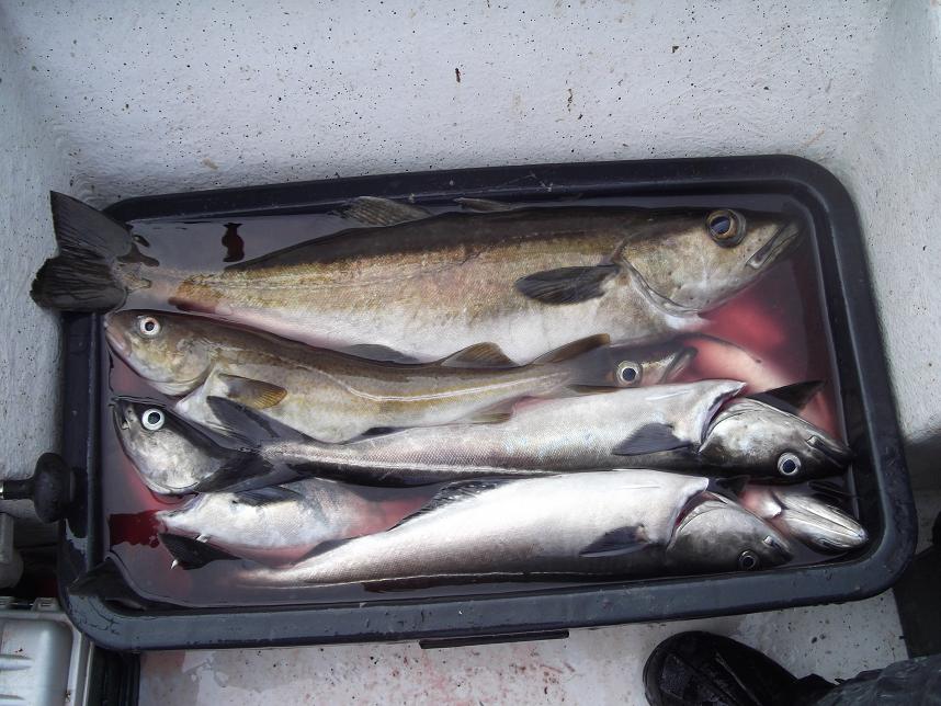 Trotz starker Drift haben wir reichlich Köhler verhaften können, etliche in guten Größen. Ein paar Dorsche bis 75 cm, 2 Leng 75 und 70 cm. Nach einem Hammerbiss habe ich im Drill einen guten Fisch mit meinem Pilker (Abriss) verloren. Am Beifänger hing trotzdem noch ein 75er Pollack.