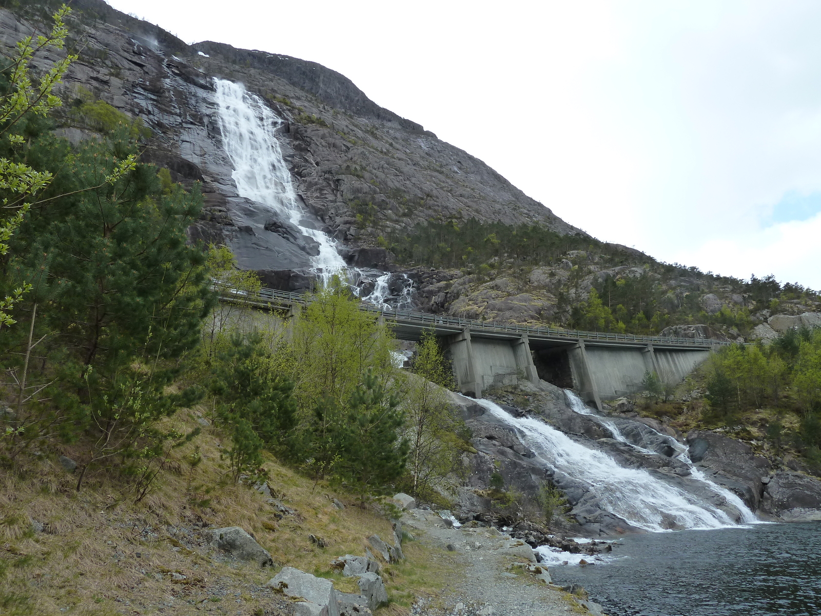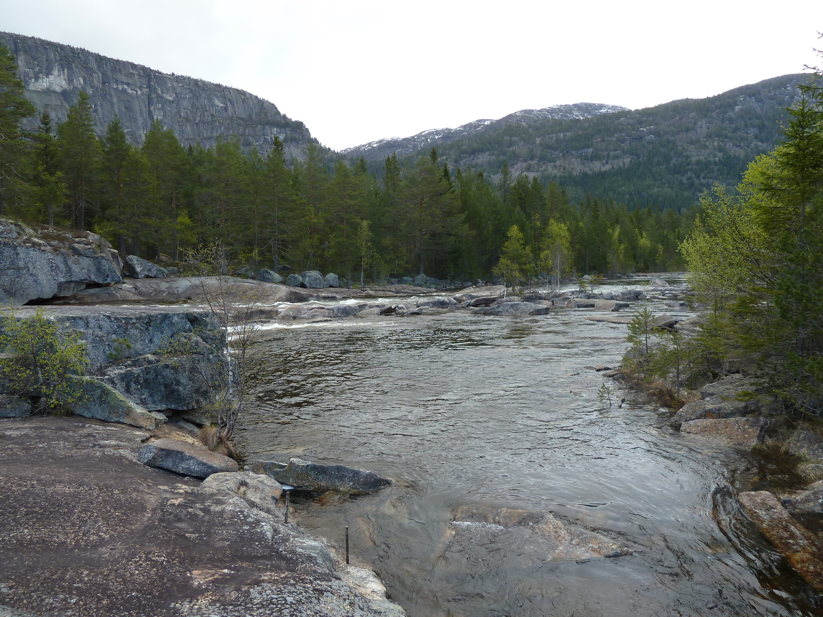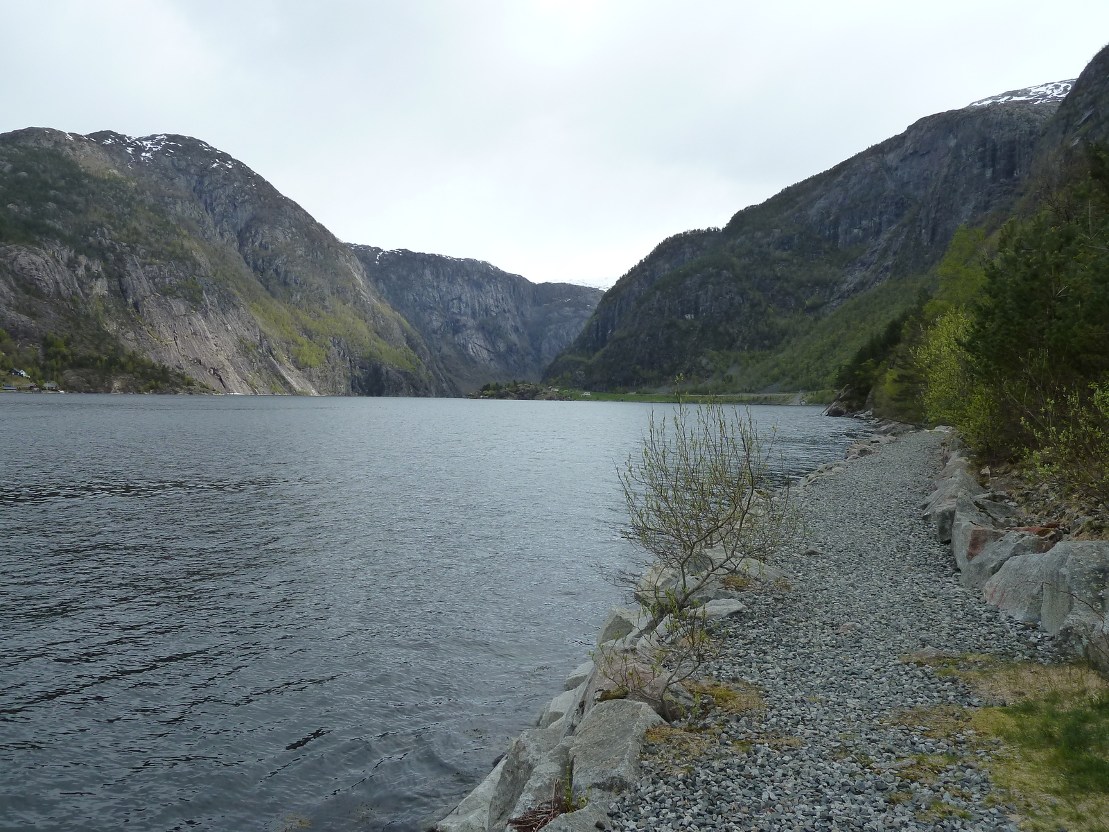 über das Setesdal (Rv9), Haukeli, E134 über Haugesund gefahren. Gleich hinter Evje haben wir einen ruhiges Plätzchen gefunden und erstmal eine kleine Schlafpause eingelegt. Gegen 07.00 Uhr ging es dann weiter über die Berge. Bei Haukeli erwartete uns ein Wintereinbruch bei -4 Grad und Schneewehen auf der Straße