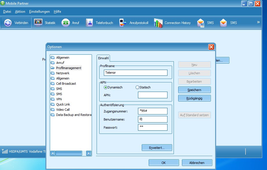 Ich habe letztes Jahr mir auch eine Telenor Karte in Norge geholt. Den UMTS Stick habe ich von Vodafone (K3765) und mir nach Anleitung aus dem I-Net die Software "Mobile Partner" installiert. Hat super geklappt. Das einmalige anlegen der Verbindung wird über Einstellungen --> Optionen --> Profilmanagement erledigt (siehe Bild).
