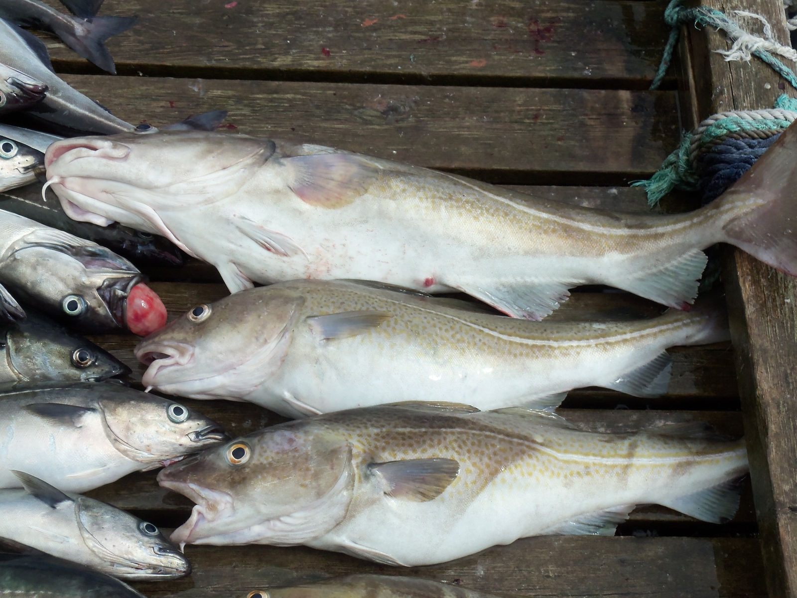 Dann hatten wir selbst Fische am Haken und konnten uns somit nicht mehr um meinen Mann und seinen "Hänger" kümmern, als dieser plötzlich ganz entsetzt rief: "Jetzt ist er weg". Ich schaute auf seine Schnur, die lose durchhing. Merkwürdig, dachte ich, ob die wohl gerissen ist? Aber, er hatte ja eine 24er drauf, es war also nicht gut möglich, dass sie gerissen war. Also ließ ich meinen Blick über das Wasser wandern und sah, in etwa 30 Metern Entfernung, einen riesigen "weißen Ball" auf dem Wasser schwimmen. "Was ist das?" fragte ich meinen Bruder Rüdiger. Adolf kurbelte ein und dann sahen wir, was da an der Angel hing. Ein riesiger Dorsch. Nachdem wir den Fisch ins Boot gehievt hatten, wer war da wieder der Größte? Natürlich mein Mann Adolf... keine Ahnung, aber den größten Fisch am Haken. Wie sagt man so schön: "Die dümmsten Bauern ernten die dicksten Kartoffeln". An diesem Tag wurden noch drei weitere große Dorsche, zwei Pollak und ca. 40 Seelachse von uns gefangen. Um 14:00 Uhr fuhren wir dann zurück. Bis alles filetiert und sauber in der Truhe war, war es schließlich 18:30 Uhr und wir hatten alle drei "Rücken".