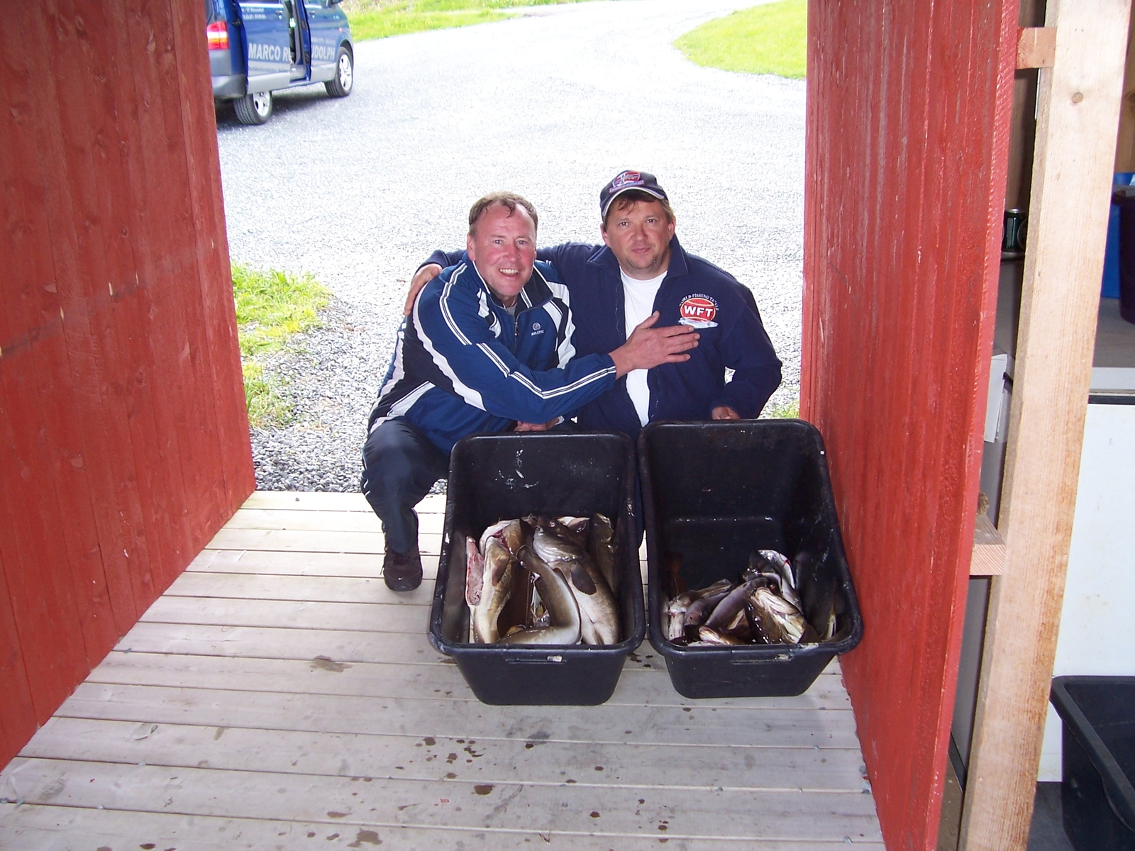 Nun kam die Sonne langsam höher und die ersten Jacken flogen durch das Boot.Ihr folgten dann noch die Hosen.Da wir null Wind hatten war die gefühlte Temperatur 25 Grad.Wasser nun schon 12,5 Grad.Nun zum Dorsch.Erster Stopp bei 25 Meter und nichts.15 Meter,noch weniger.Also dann wieder auf 7-10 Meter.Fast jeder Wurf ein Dorsch,untermaßige waren sehr selten.Kurz mal die Funke an und Tino`s Boot kontaktiert.Keine nennenswerten Fänge,waren unsere beiden "Spezis"doch wieder auf Großfisch aus.Unsere Kisten waren schon gut gefüllt und immer wieder zwischendurch wurden die Fische versorgt(ausgenommen),sollte ja auch nicht gar werden in der eigenen Brühe.Einer in unseren Boot versuchte ständig mit kleinen Pilkern auf Pollack und Köhler zu angeln.Die Drifft sorgte dafür das wir langsam ins tiefere Wasser kamem.So bei 20 Metern knallte der erste bessere Köhler an die Angel.Also alle schnell die zweite Angel und los gings.In kurzer Zeit waren 8 schöne Köhler zwischen 60 und 70 cm im Boot,und immer wieder zwischendurch der eine oder andere Pollack(bis 80 cm).Der Spuk war von einer zur anderen Sekunde vorbei.Die großen Schwärme waren eh noch nicht im Fjord.Unser soll war mehr als erfüllt und nach dem Fang kommt wie immer die Arbeit.Abruch wenn es am schönsten ist,und auserdem haben wir Urlaub.Ausgetrocknet von der Sonne dann erst mal ein bis drei Bierchen.Die Verarbeitung ging rasch und schnell lagen die nächsten 15 Kilo Fillet in der Truhe.Nach 3 tagen der Fazit,jetzt locker angehen und mal andere Arten fangen.