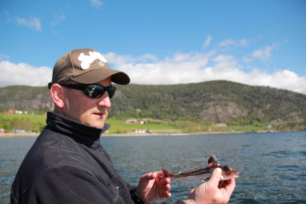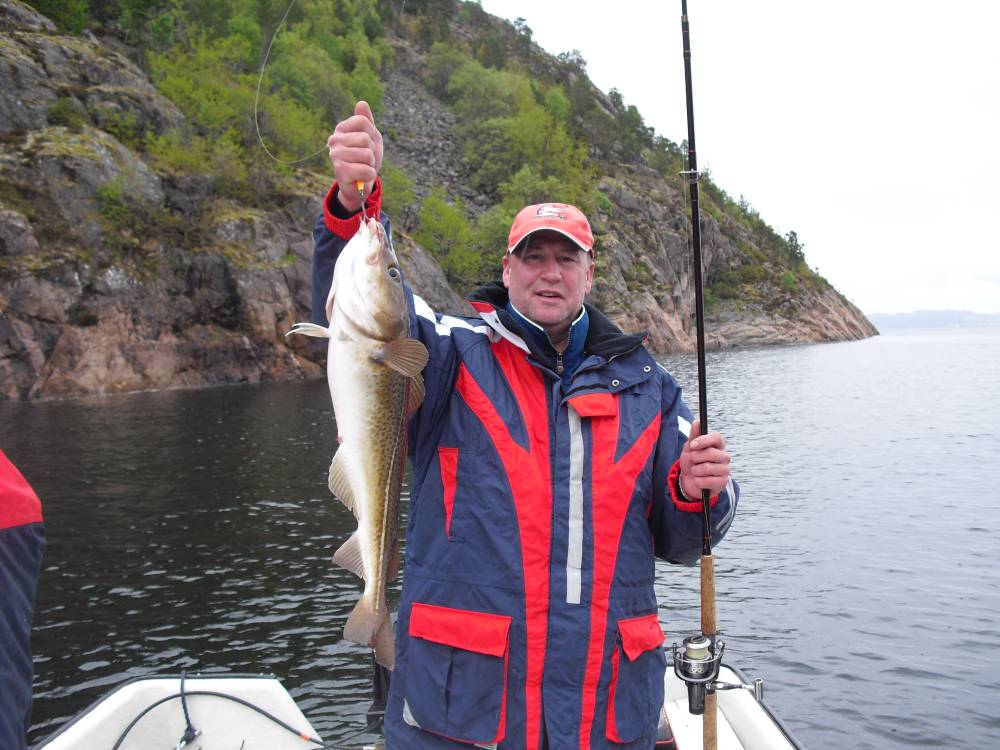 Nun kam die Sonne langsam höher und die ersten Jacken flogen durch das Boot.Ihr folgten dann noch die Hosen.Da wir null Wind hatten war die gefühlte Temperatur 25 Grad.Wasser nun schon 12,5 Grad.Nun zum Dorsch.Erster Stopp bei 25 Meter und nichts.15 Meter,noch weniger.Also dann wieder auf 7-10 Meter.Fast jeder Wurf ein Dorsch,untermaßige waren sehr selten.Kurz mal die Funke an und Tino`s Boot kontaktiert.Keine nennenswerten Fänge,waren unsere beiden "Spezis"doch wieder auf Großfisch aus.Unsere Kisten waren schon gut gefüllt und immer wieder zwischendurch wurden die Fische versorgt(ausgenommen),sollte ja auch nicht gar werden in der eigenen Brühe.Einer in unseren Boot versuchte ständig mit kleinen Pilkern auf Pollack und Köhler zu angeln.Die Drifft sorgte dafür das wir langsam ins tiefere Wasser kamem.So bei 20 Metern knallte der erste bessere Köhler an die Angel.Also alle schnell die zweite Angel und los gings.In kurzer Zeit waren 8 schöne Köhler zwischen 60 und 70 cm im Boot,und immer wieder zwischendurch der eine oder andere Pollack(bis 80 cm).Der Spuk war von einer zur anderen Sekunde vorbei.Die großen Schwärme waren eh noch nicht im Fjord.Unser soll war mehr als erfüllt und nach dem Fang kommt wie immer die Arbeit.Abruch wenn es am schönsten ist,und auserdem haben wir Urlaub.Ausgetrocknet von der Sonne dann erst mal ein bis drei Bierchen.Die Verarbeitung ging rasch und schnell lagen die nächsten 15 Kilo Fillet in der Truhe.Nach 3 tagen der Fazit,jetzt locker angehen und mal andere Arten fangen.