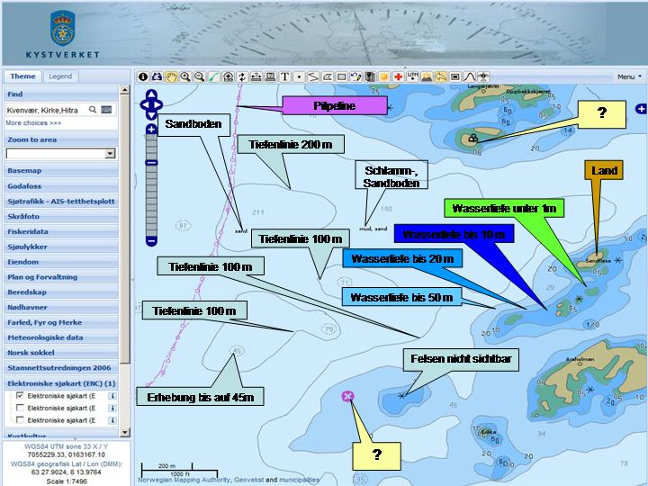 Ok Jürgen noch mal für dich. In den hellblauen Gebieten liegt die Wassertiefe zwischen 10 und 20 Metern, bei den Dunkelblauen die Tiefe unter 10m. Grüne Gebiete sind bei Ebbe trocken. Wenn in den Gebieten Pluszeichen zu sehen sind sind das Steine unter Wasser die auch bis knapp unter die Oberfläche reichen können.