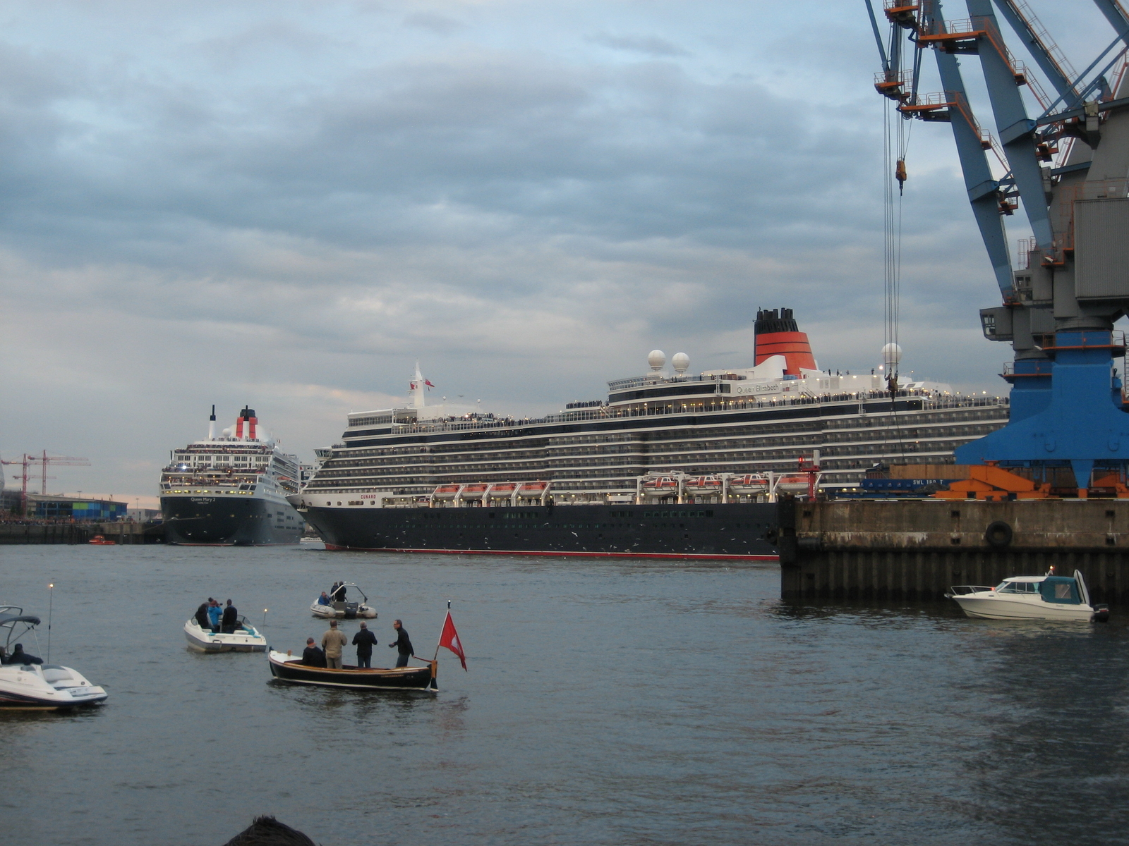 "Haben sie schon etwas gefangen?" oder "Was fängt man denn hier?" sind sicher die meistgestellten Fragen, Jürgen :cool:. Zu meiner Überraschung sah man, teils direkt in den Menschenmengen" immer mal wieder einen Angler. Entweder mit Zandergeschirr oder aber Grundmontagen. Cunard, die Reederei der beiden Kreuzfahrer, sowie die Kreuzfahrtgäste, sind seit Jahren vom Hamburger Elb-Publikum und der Begeisterung für die Traumschiffe so angetan, dass sie aufgrund dessen Hamburg als festen Linienstützpunkt ins Programm genommen haben, was anfänglich so nicht geplant war. Hier nun erstmal ein paar Bilder ...