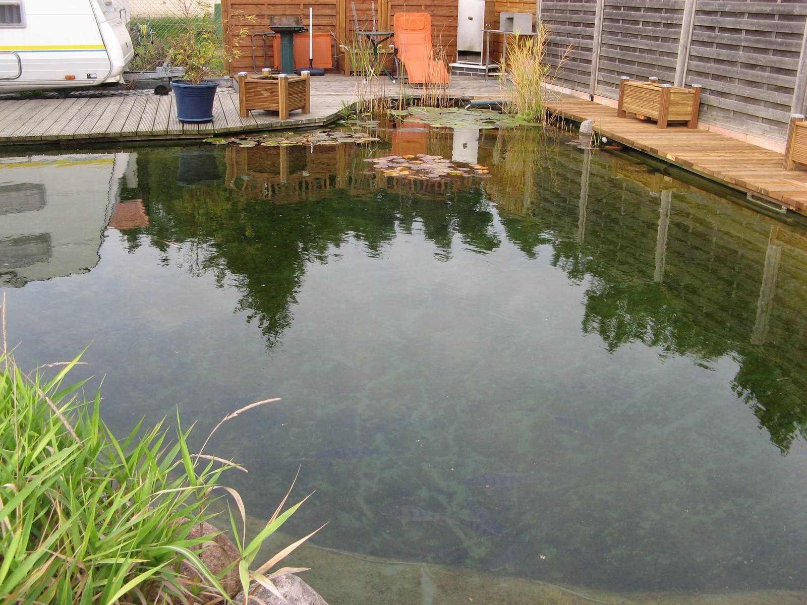 Der Teich dient in erster Linie als Schwimmteich - es gibt nichts Besseres im Sommer! Wasserfläche knapp 150 qm, ca. 1,70 bis 1,80 tief. Gefiltert wird das Wasser über 2 Kreisläufe - einmal über einen Naturteich, der aber wegen Platzmangels zu klein ausgefallen ist, um die ganze Arbeit allein zu verrichten. Deshalb wird er von einer großen Sandfilteranlage (750 l) unterstützt. Gegen Schwebealgen wirkt ein 72 W UVC Brenner. Es gibt einen Oberflächenskimmer und einen Bodenabsauger. Gereinigt wird zusätzlich alle 3 - 4 Wochen, allerdings nur, weil diese (Foto) Kameraden doch einiges an Schmutz produzieren!