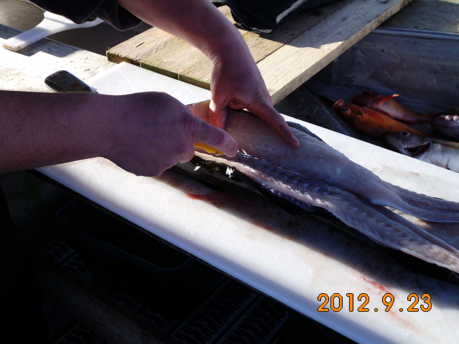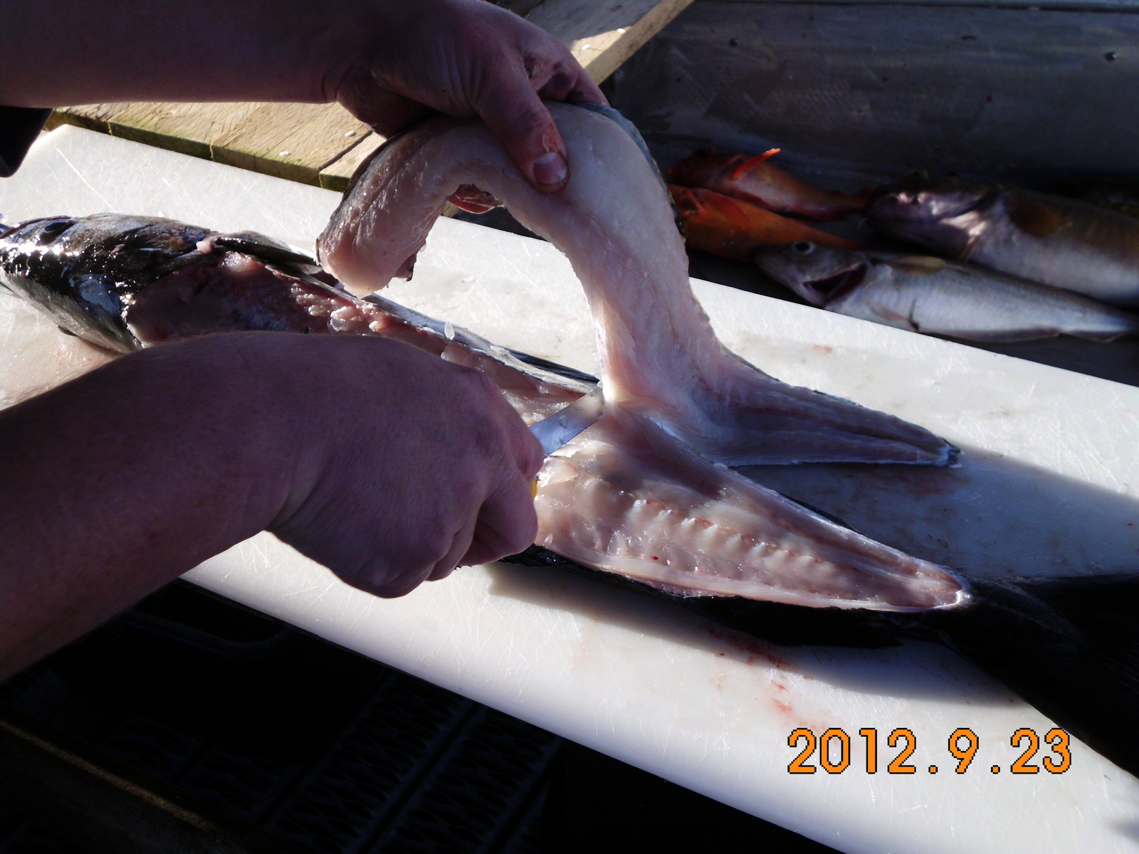 Davon haben wir dann 4100 NOK verballert...Fischtechnisch haben wir heute wieder auf Tirivet und in der Rinne daneben zugeschlagen. Die Drift war heute doch anfangs sehr stark, aber trotzdem fingen wir wieder die Seelachse in Tiefen zwischen 80 und 100 Meter Tiefe.