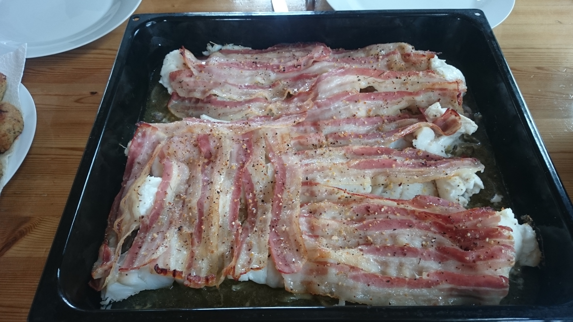 Jetzt sind wir erst mal alle satt, es gab Pollackpfanne mit Schinkenspeck LC:)