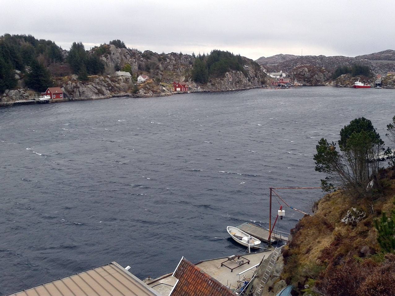 Der Sturm nimmt immer mehr zu. Selbst hier im Fjord bilden sich jetzt weiße Schaumkronen. Gestern Abend war es hier fast Windstill, da der Sturm aus Nord gekommen ist, heute voll von Süd.