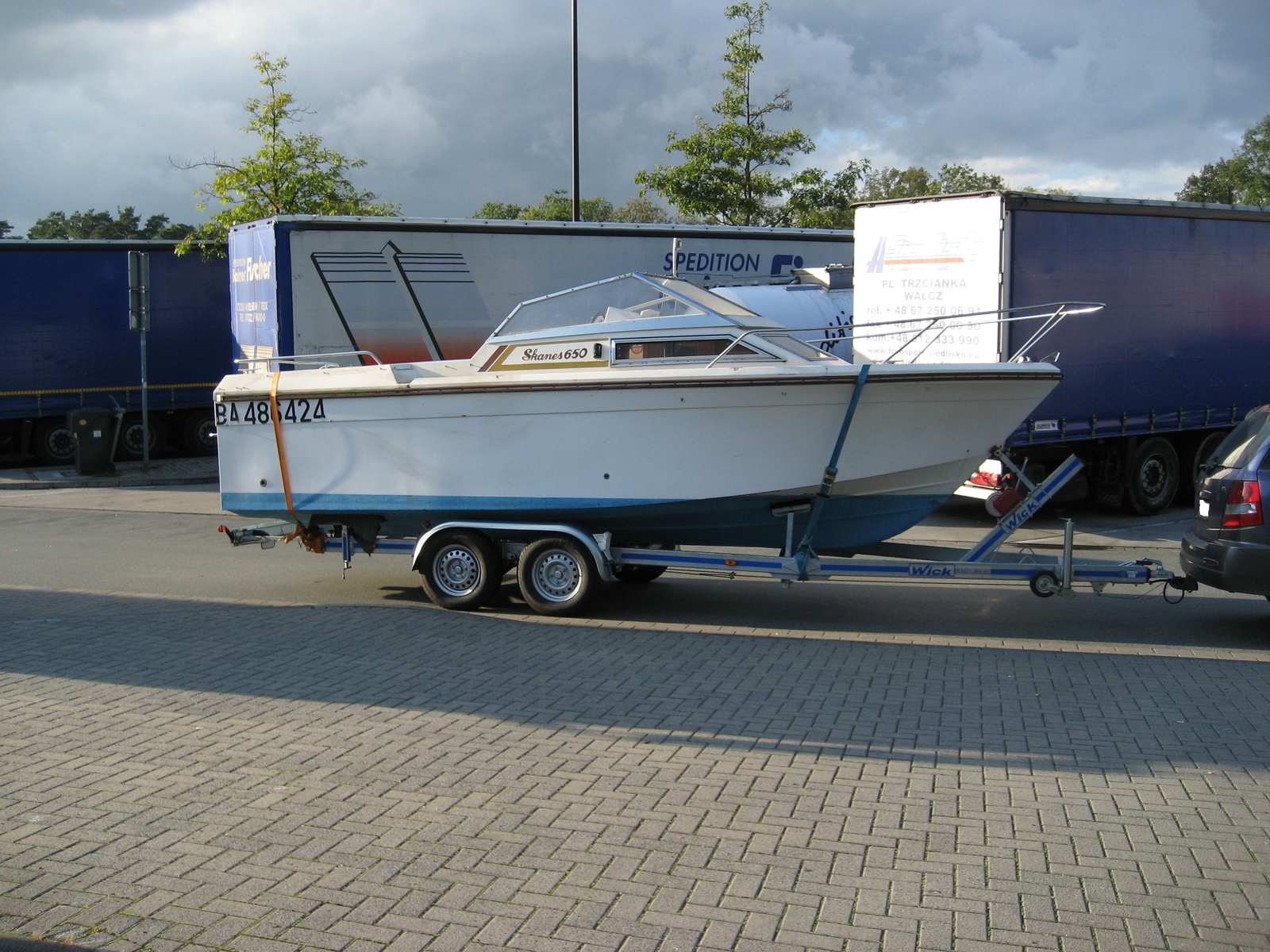 Lange habe ich für mein Vorhaben nach einem Boot wie diesem gesucht, Länge (6,50 m), Breite (2,50 m) und Freibord ( Wasserlinie bis oberste Kante, nicht Scheuerleiste 1,30 m) passen perferkt. Da Motor und Z-Antrieb raus sind, wiegt es derzeit ca. 1,1 to. Mein vorheriges Projekt (altes Reusenboot) ist zwar nahezu abgeschlossen, allerdings gab es zwischenzeitlich sehr ärgerliche Begleitumstände, auf die ich hier aber nicht im Detail eingehen möchte. Das neue Projekt habe ich gestern aus dem Ruhrpott geholt und bin bei dem Verkehr da unten fast wahnsinnig geworden (Unfälle, Baustellen, tierisches Verkehrsaufkommen und Staus am Stück):(.