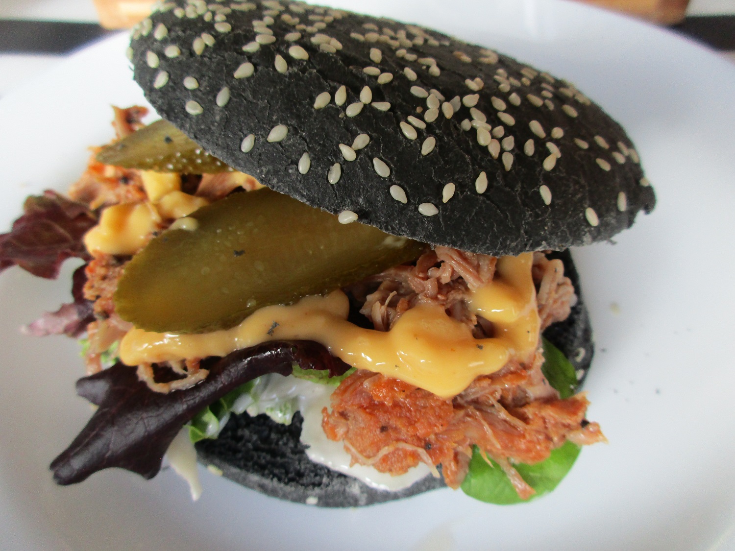 gestern schwarze (mit sepiatinte gefärbte) buns mit pulled pork und chipotlesauce - recht scharf aber sehr lecker....LC:)
