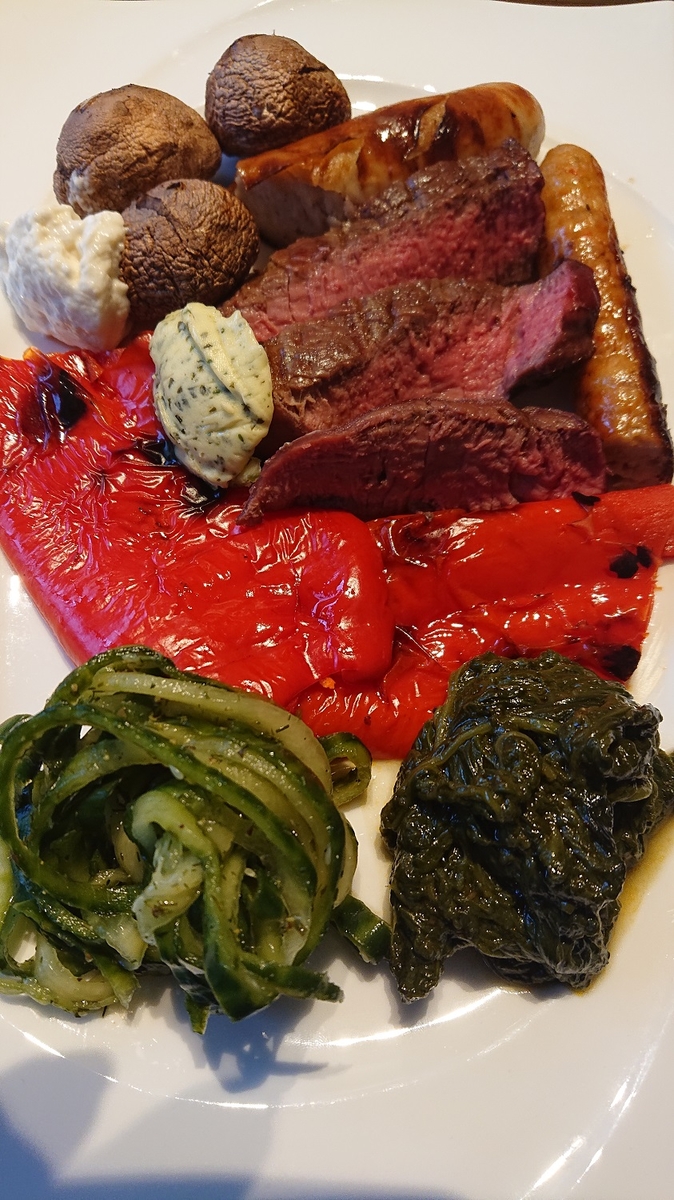 rindersteak, gurkensalat und würstchen (ingwer-limette, chili-käse)...pilze und papis