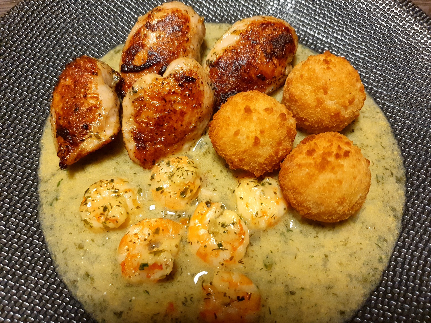 Fischbouletten mit KatoSa - die Hoffnung auf Frischfisch 2021 bleibt Wachtelbrust, Garnelen und Trüffelbällchen
