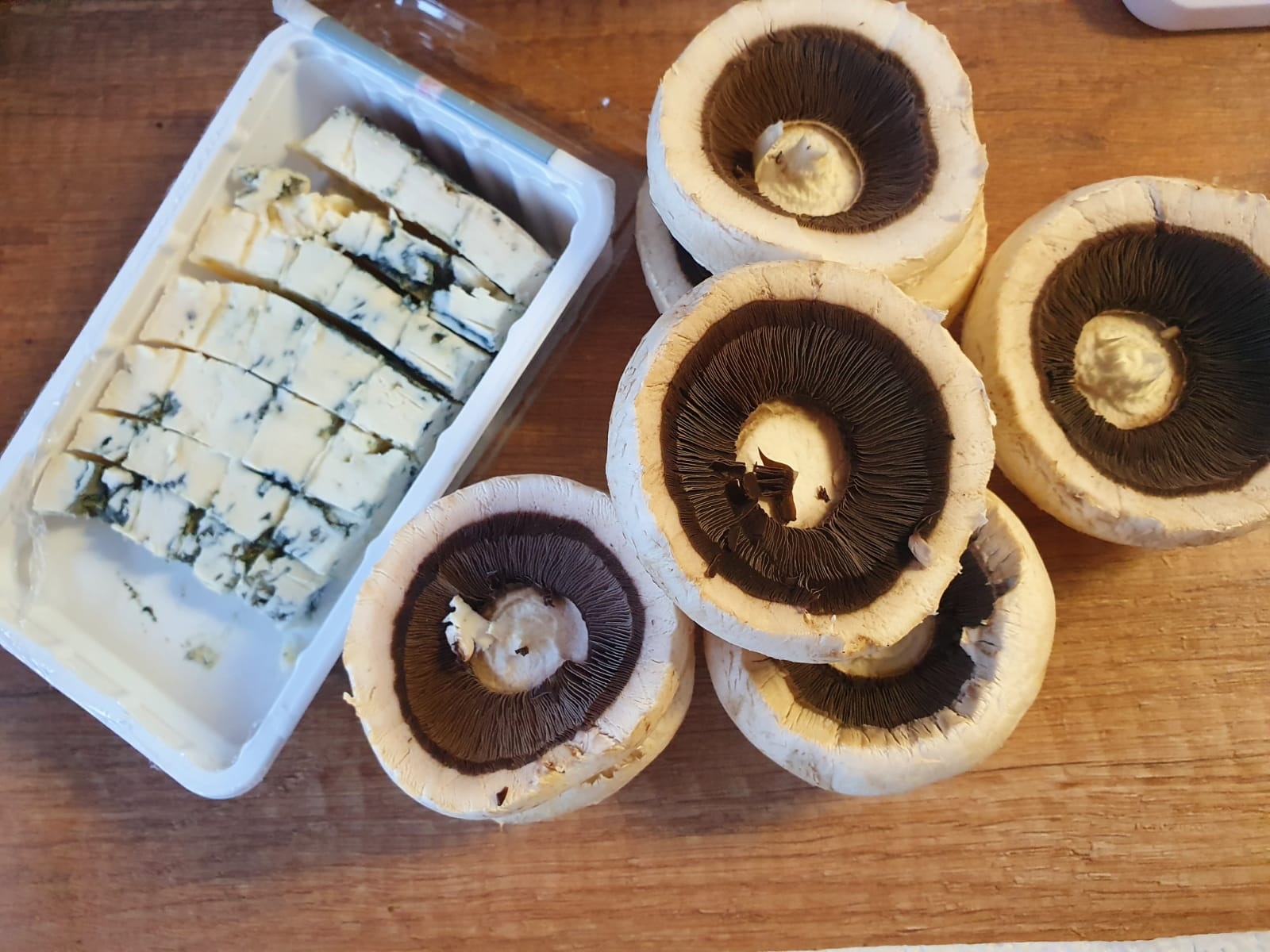 champignons gefüllt mit seehecht-zwiebel-resteschnibbelpilze...überbacken