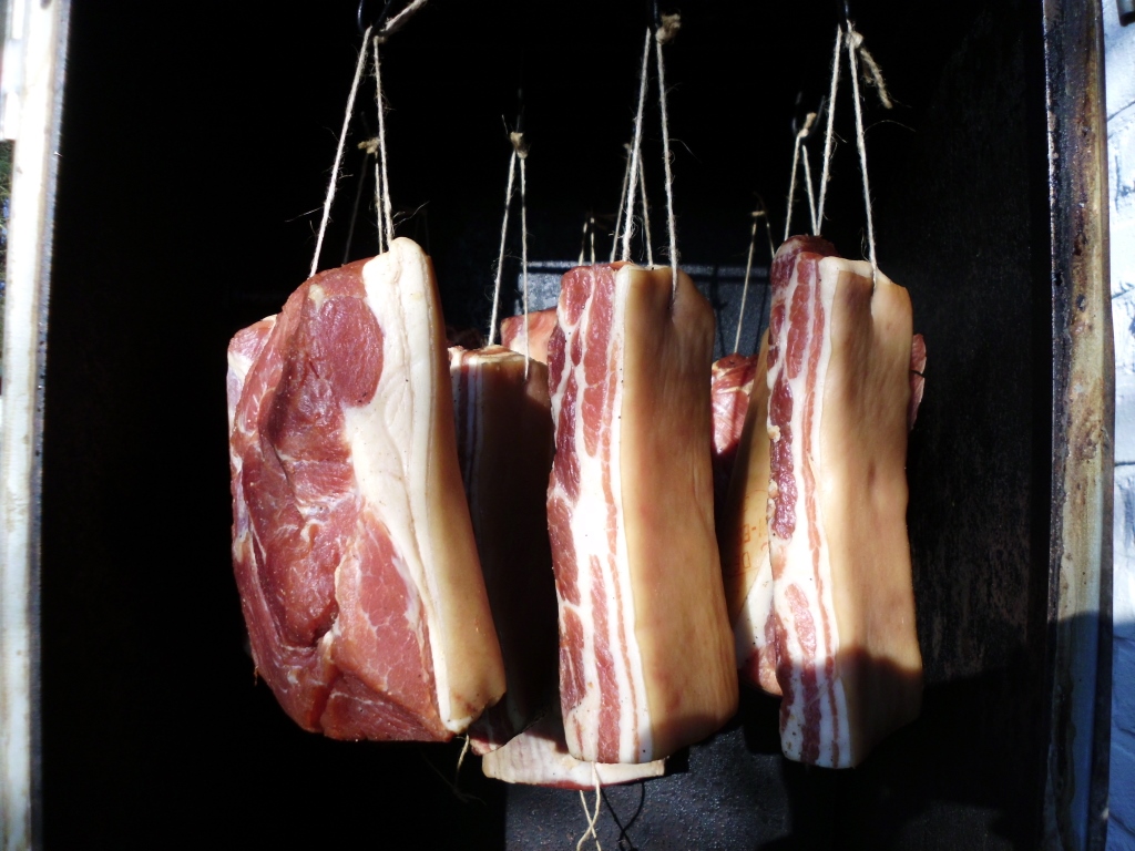 bevor das fleisch in den räucherofen kommt, an der luft trocknen, muss es trocken sein sonst nimmt es keine farbe an.