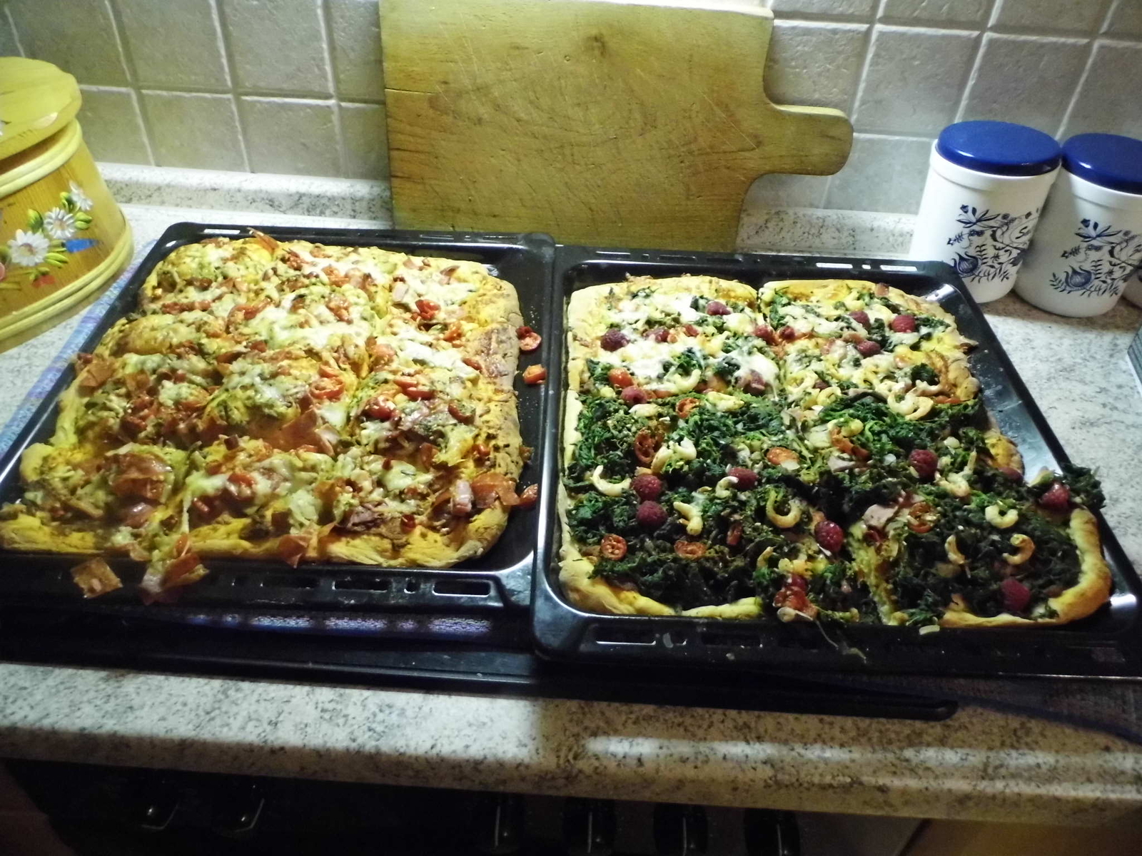 und eine hälfte mit Pitza Käse-MozarellaUnd das ganze für ca. 25 min Umluft im Auge behalten bis der Boden sich hebt und die Ränder hellbraun werden.