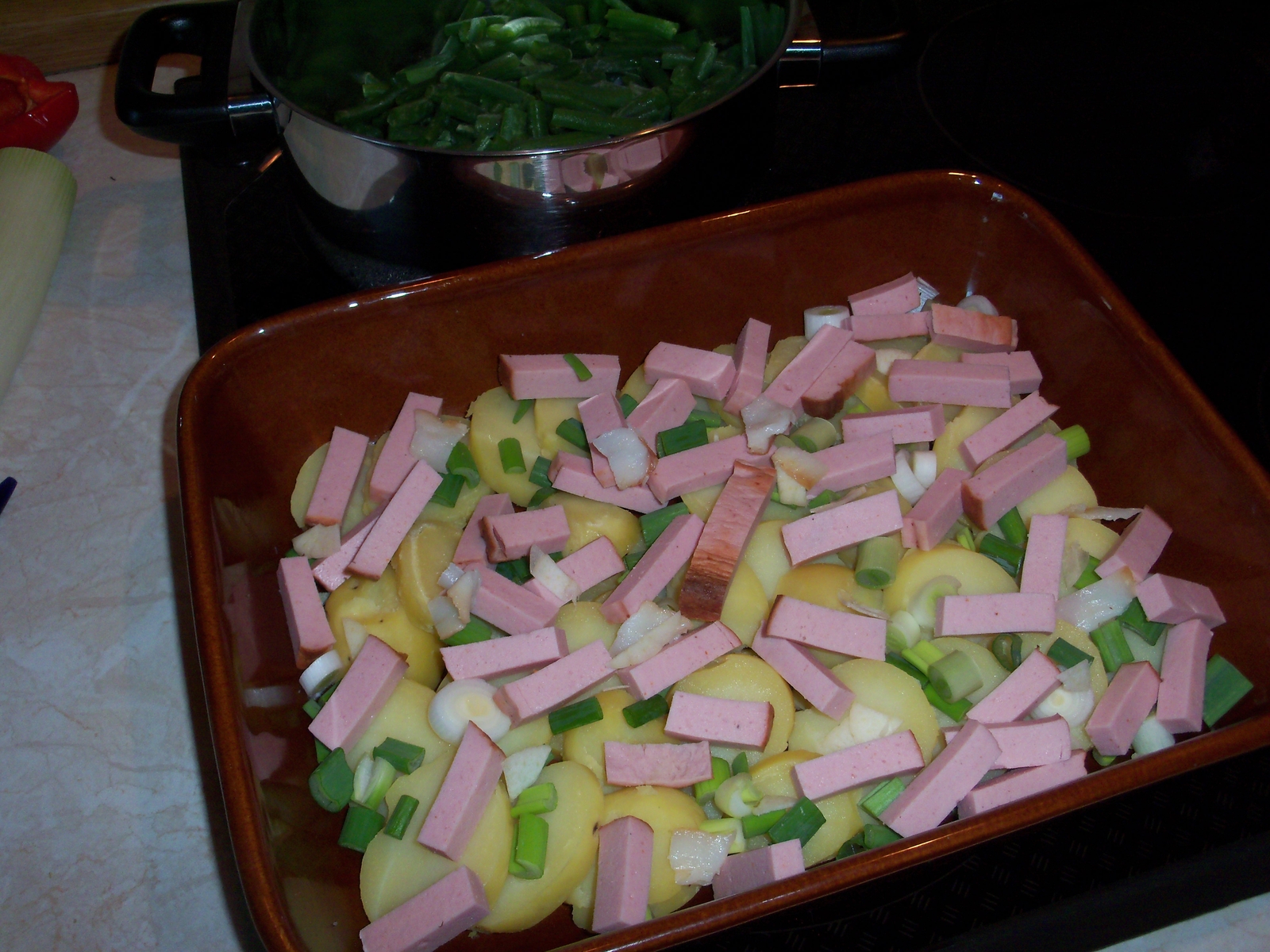 Bei uns gabs auch Leberkäse......als Auflauf mit Kartoffeln, grünen Bohnen, Lauch, einer Spezialsosse und Käse überbacken.....und dazu Weizen im FCB Glas
