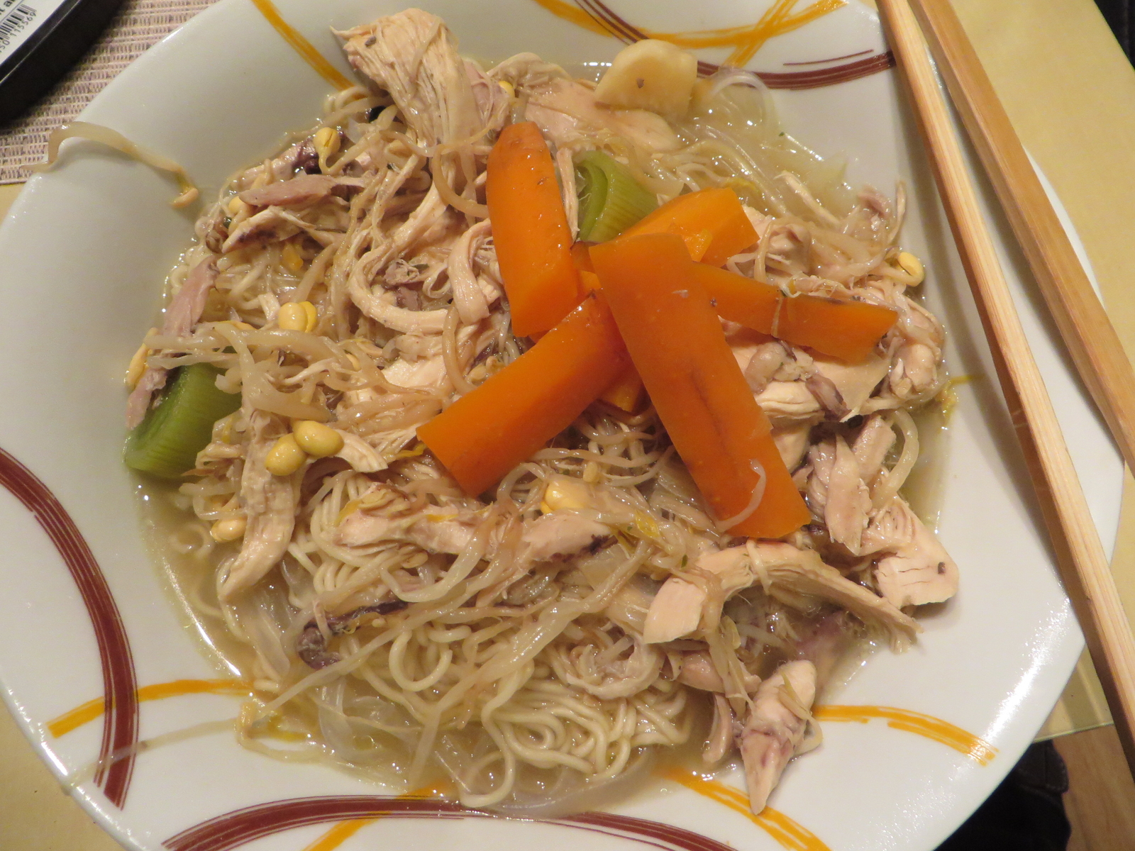die brühe bestand aus huhn ,zwiebel,karotte,lauch,sellerie,mungobohnen und gewüzen.